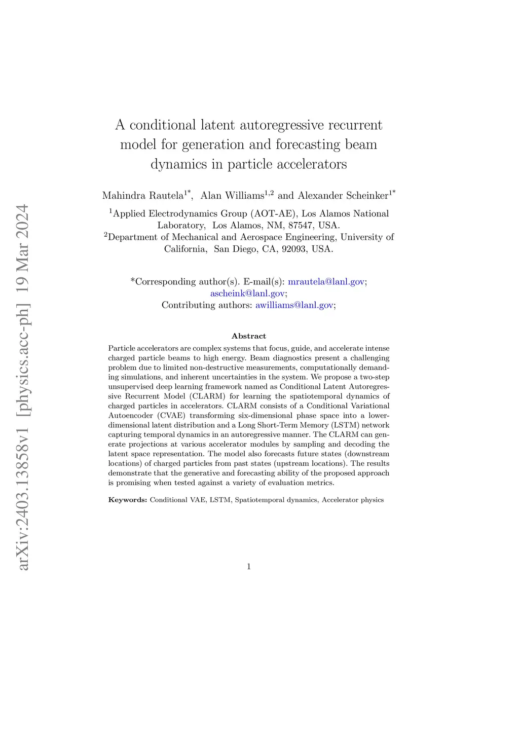 Particle accelerators are complex systems that focus, guide, and accelerate intense charged particle beams to high energy. Beam diagnostics present a challenging problem due to limited non-destructive measurements, computationally demanding simulations, and inherent uncertainties in the system. We propose a two-step unsupervised deep learning framework named as Conditional Latent Autoregressive Recurrent Model (CLARM) for learning the spatiotemporal dynamics of charged particles in accelerators. CLARM consists of a Conditional Variational Autoencoder (CVAE) transforming six-dimensional phase space into a lower-dimensional latent distribution and a Long Short-Term Memory (LSTM) network capturing temporal dynamics in an autoregressive manner. The CLARM can generate projections at various accelerator modules by sampling and decoding the latent space representation. The model also forecasts future states (downstream locations) of charged particles from past states (upstream locations). The results demonstrate that the generative and forecasting ability of the proposed approach is promising when tested against a variety of evaluation metrics.
