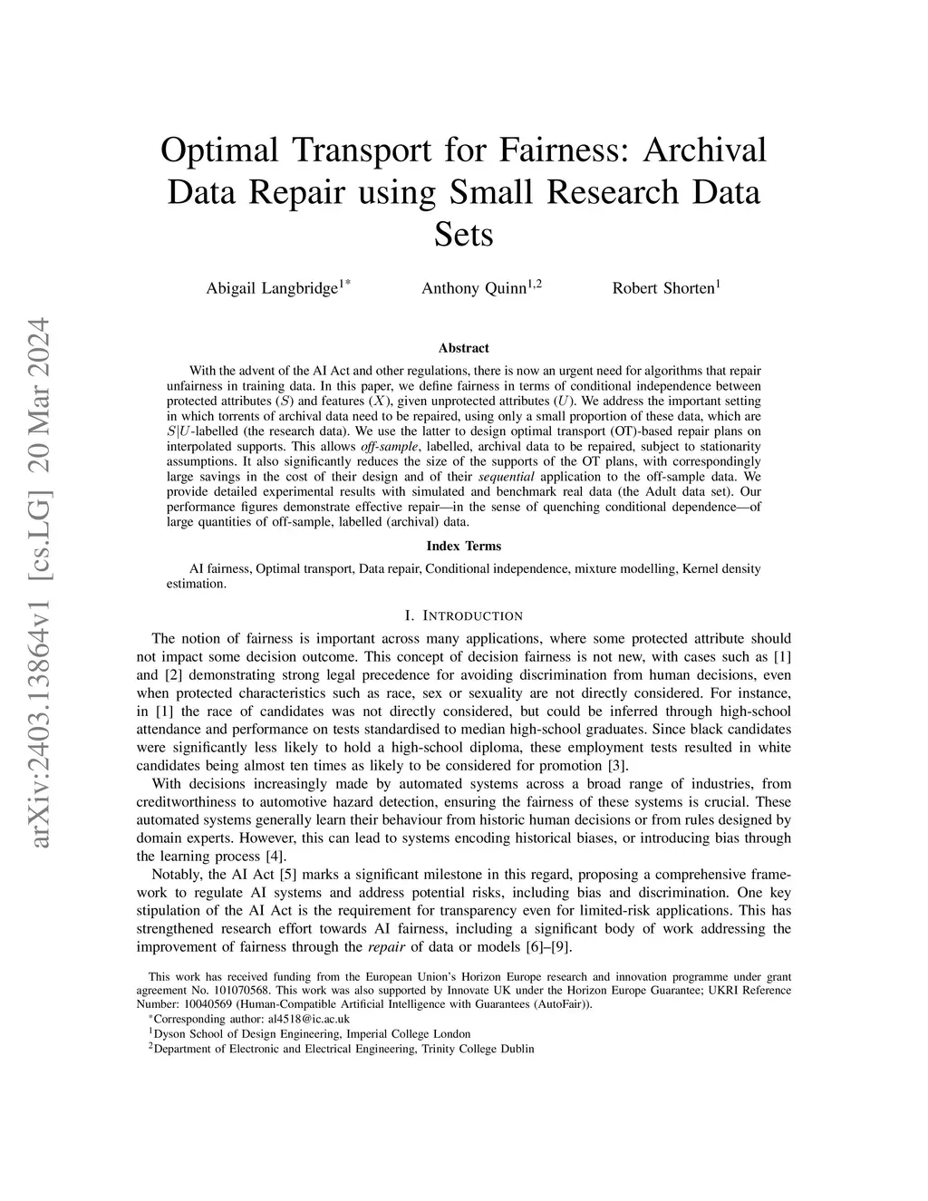 With the advent of the AI Act and other regulations, there is now an urgent need for algorithms that repair unfairness in training data. In this paper, we define fairness in terms of conditional independence between protected attributes () and features (), given unprotected attributes (). We address the important setting in which torrents of archival data need to be repaired, using only a small proportion of these data, which are -labelled (the research data). We use the latter to design optimal transport (OT)-based repair plans on interpolated supports. This allows {\em off-sample}, labelled, archival data to be repaired, subject to stationarity assumptions. It also significantly reduces the size of the supports of the OT plans, with correspondingly large savings in the cost of their design and of their {\em sequential\/} application to the off-sample data. We provide detailed experimental results with simulated and benchmark real data (the Adult data set). Our performance figures demonstrate effective repair -- in the sense of quenching conditional dependence -- of large quantities of off-sample, labelled (archival) data.