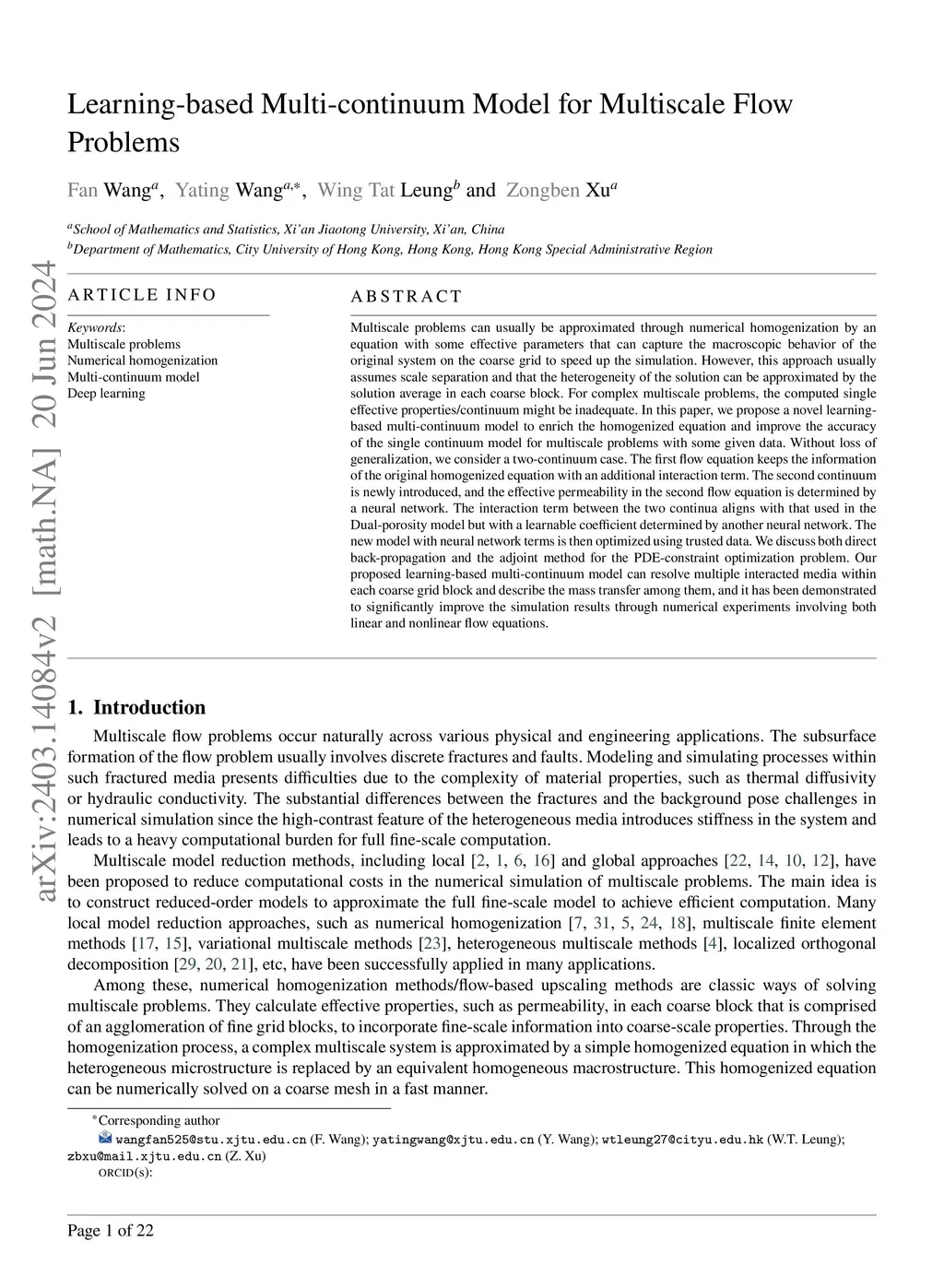 Multiscale problems can usually be approximated through numerical homogenization by an equation with some effective parameters that can capture the macroscopic behavior of the original system on the coarse grid to speed up the simulation. However, this approach usually assumes scale separation and that the heterogeneity of the solution can be approximated by the solution average in each coarse block. For complex multiscale problems, the computed single effective properties/continuum might be inadequate. In this paper, we propose a novel learning-based multi-continuum model to enrich the homogenized equation and improve the accuracy of the single continuum model for multiscale problems with some given data. Without loss of generalization, we consider a two-continuum case. The first flow equation keeps the information of the original homogenized equation with an additional interaction term. The second continuum is newly introduced, and the effective permeability in the second flow equation is determined by a neural network. The interaction term between the two continua aligns with that used in the Dual-porosity model but with a learnable coefficient determined by another neural network. The new model with neural network terms is then optimized using trusted data. We discuss both direct back-propagation and the adjoint method for the PDE-constraint optimization problem. Our proposed learning-based multi-continuum model can resolve multiple interacted media within each coarse grid block and describe the mass transfer among them, and it has been demonstrated to significantly improve the simulation results through numerical experiments involving both linear and nonlinear flow equations.
