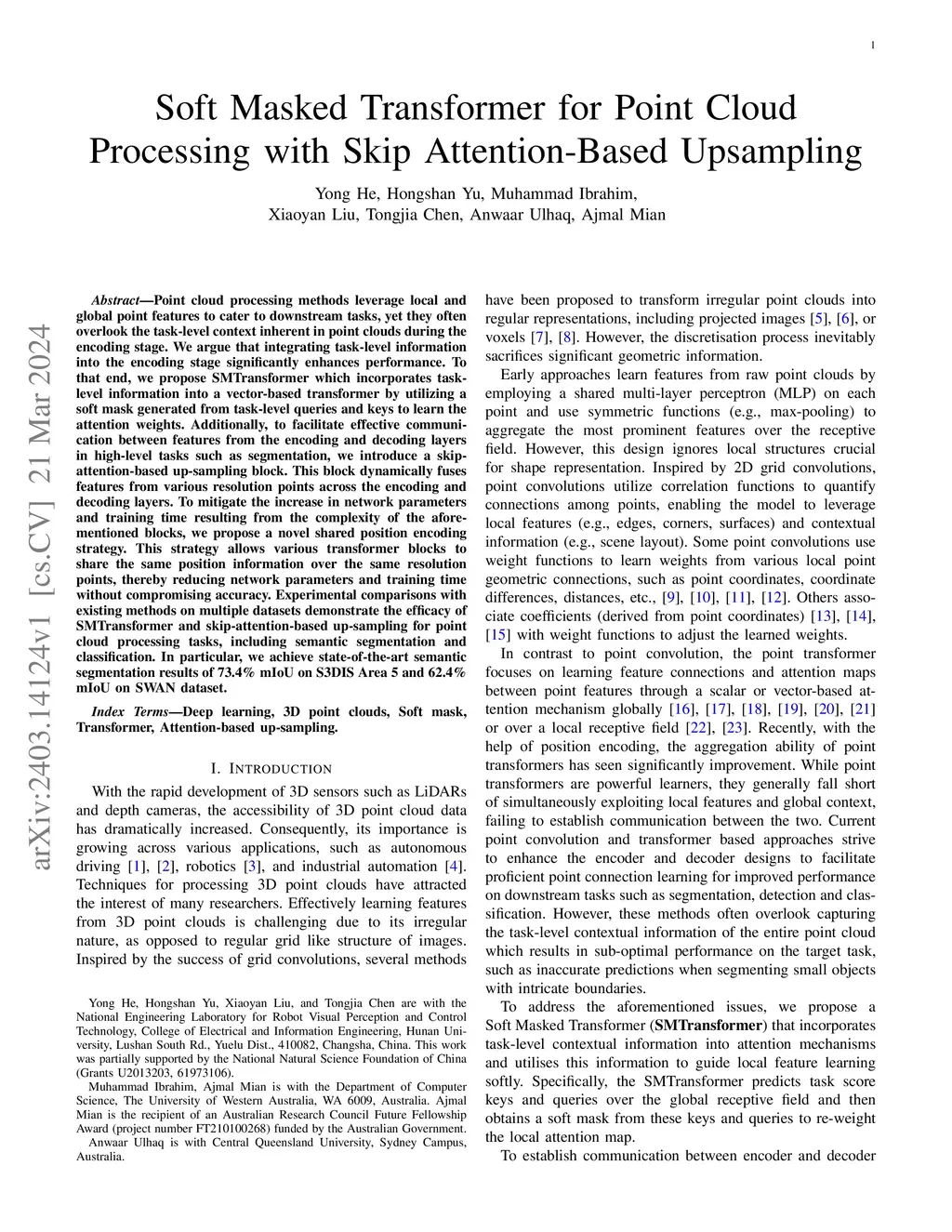 Soft Masked Transformer for Point Cloud Processing with Skip Attention-Based Upsampling
