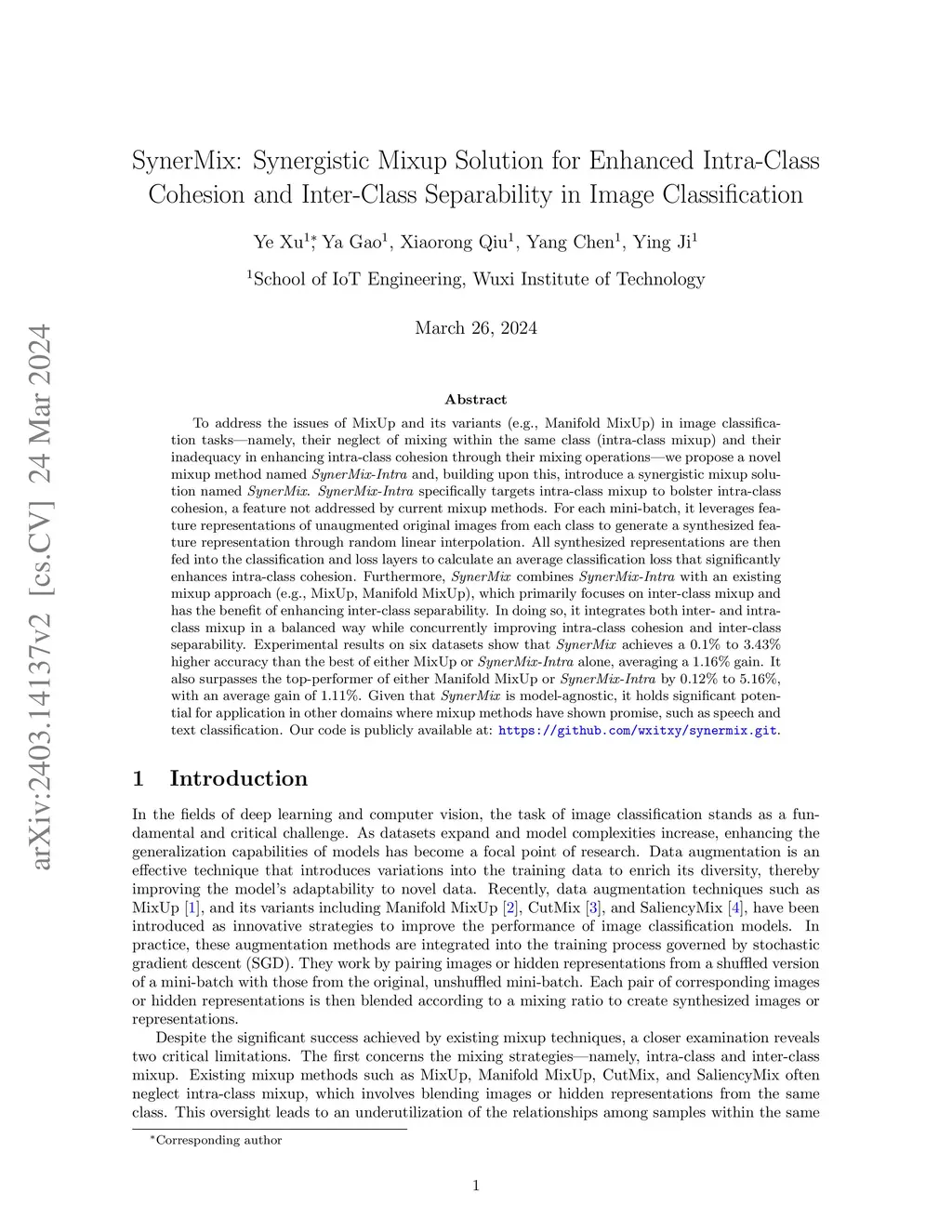 To address the issues of MixUp and its variants (e.g., Manifold MixUp) in image classification tasks-namely, their neglect of mixing within the same class (intra-class mixup) and their inadequacy in enhancing intra-class cohesion through their mixing operations-we propose a novel mixup method named SynerMix-Intra and, building upon this, introduce a synergistic mixup solution named SynerMix. SynerMix-Intra specifically targets intra-class mixup to bolster intra-class cohesion, a feature not addressed by current mixup methods. For each mini-batch, it leverages feature representations of unaugmented original images from each class to generate a synthesized feature representation through random linear interpolation. All synthesized representations are then fed into the classification and loss layers to calculate an average classification loss that significantly enhances intra-class cohesion. Furthermore, SynerMix combines SynerMix-Intra with an existing mixup approach (e.g., MixUp, Manifold MixUp), which primarily focuses on inter-class mixup and has the benefit of enhancing inter-class separability. In doing so, it integrates both inter- and intra-class mixup in a balanced way while concurrently improving intra-class cohesion and inter-class separability. Experimental results on six datasets show that SynerMix achieves a 0.1% to 3.43% higher accuracy than the best of either MixUp or SynerMix-Intra alone, averaging a 1.16% gain. It also surpasses the top-performer of either Manifold MixUp or SynerMix-Intra by 0.12% to 5.16%, with an average gain of 1.11%. Given that SynerMix is model-agnostic, it holds significant potential for application in other domains where mixup methods have shown promise, such as speech and text classification. Our code is publicly available at: https://github.com/wxitxy/synermix.git.