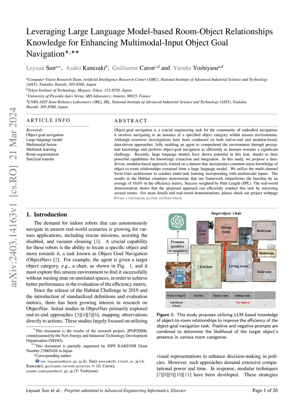 Object-goal navigation is a crucial engineering task for the community of embodied navigation; it involves navigating to an instance of a specified object category within unseen environments. Although extensive investigations have been conducted on both end-to-end and modular-based, data-driven approaches, fully enabling an agent to comprehend the environment through perceptual knowledge and perform object-goal navigation as efficiently as humans remains a significant challenge. Recently, large language models have shown potential in this task, thanks to their powerful capabilities for knowledge extraction and integration. In this study, we propose a data-driven, modular-based approach, trained on a dataset that incorporates common-sense knowledge of object-to-room relationships extracted from a large language model. We utilize the multi-channel Swin-Unet architecture to conduct multi-task learning incorporating with multimodal inputs. The results in the Habitat simulator demonstrate that our framework outperforms the baseline by an average of 10.6% in the efficiency metric, Success weighted by Path Length (SPL). The real-world demonstration shows that the proposed approach can efficiently conduct this task by traversing several rooms. For more details and real-world demonstrations, please check our project webpage (https://sunleyuan.github.io/ObjectNav).