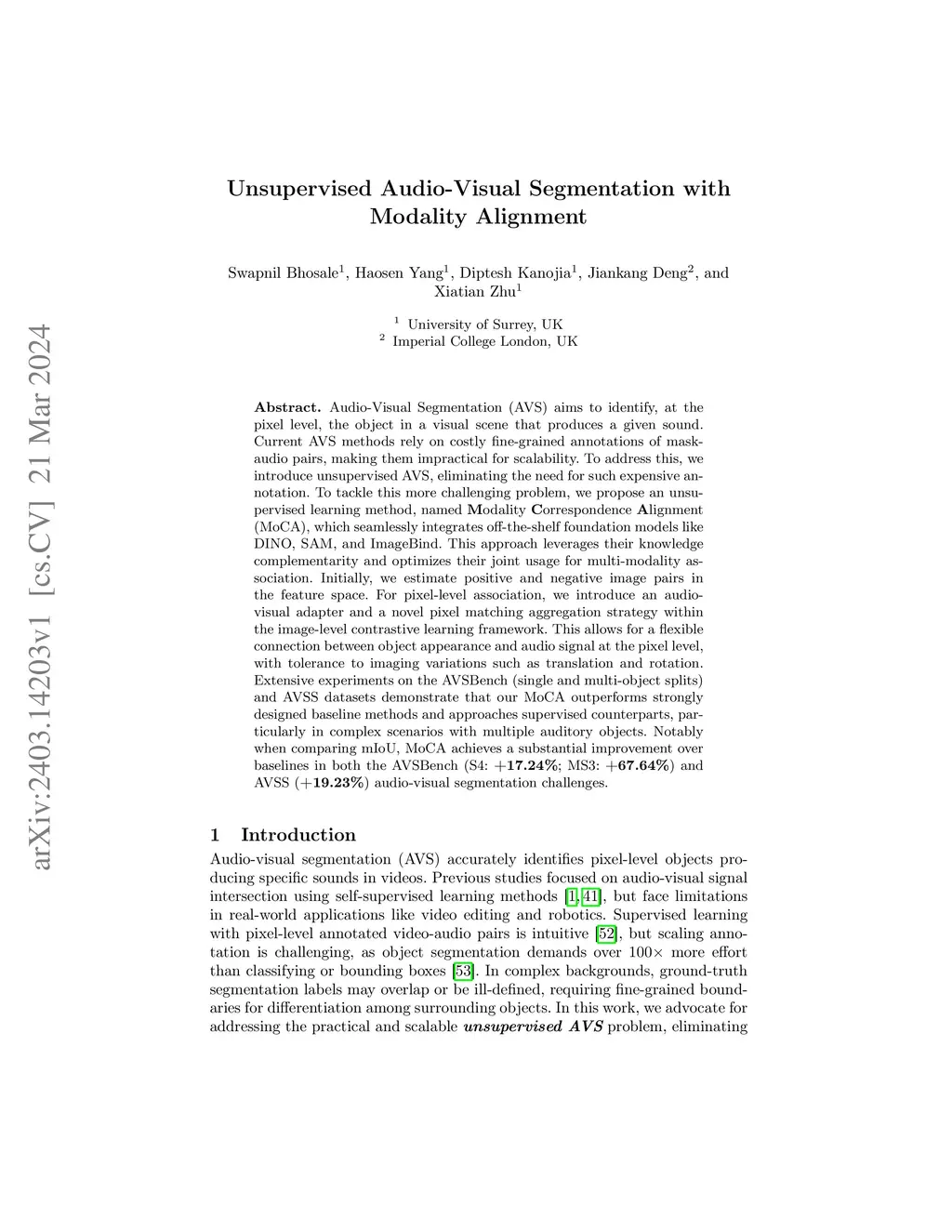Audio-Visual Segmentation (AVS) aims to identify, at the pixel level, the object in a visual scene that produces a given sound. Current AVS methods rely on costly fine-grained annotations of mask-audio pairs, making them impractical for scalability. To address this, we introduce unsupervised AVS, eliminating the need for such expensive annotation. To tackle this more challenging problem, we propose an unsupervised learning method, named Modality Correspondence Alignment (MoCA), which seamlessly integrates off-the-shelf foundation models like DINO, SAM, and ImageBind. This approach leverages their knowledge complementarity and optimizes their joint usage for multi-modality association. Initially, we estimate positive and negative image pairs in the feature space. For pixel-level association, we introduce an audio-visual adapter and a novel pixel matching aggregation strategy within the image-level contrastive learning framework. This allows for a flexible connection between object appearance and audio signal at the pixel level, with tolerance to imaging variations such as translation and rotation. Extensive experiments on the AVSBench (single and multi-object splits) and AVSS datasets demonstrate that our MoCA outperforms strongly designed baseline methods and approaches supervised counterparts, particularly in complex scenarios with multiple auditory objects. Notably when comparing mIoU, MoCA achieves a substantial improvement over baselines in both the AVSBench (S4: +17.24%; MS3: +67.64%) and AVSS (+19.23%) audio-visual segmentation challenges.