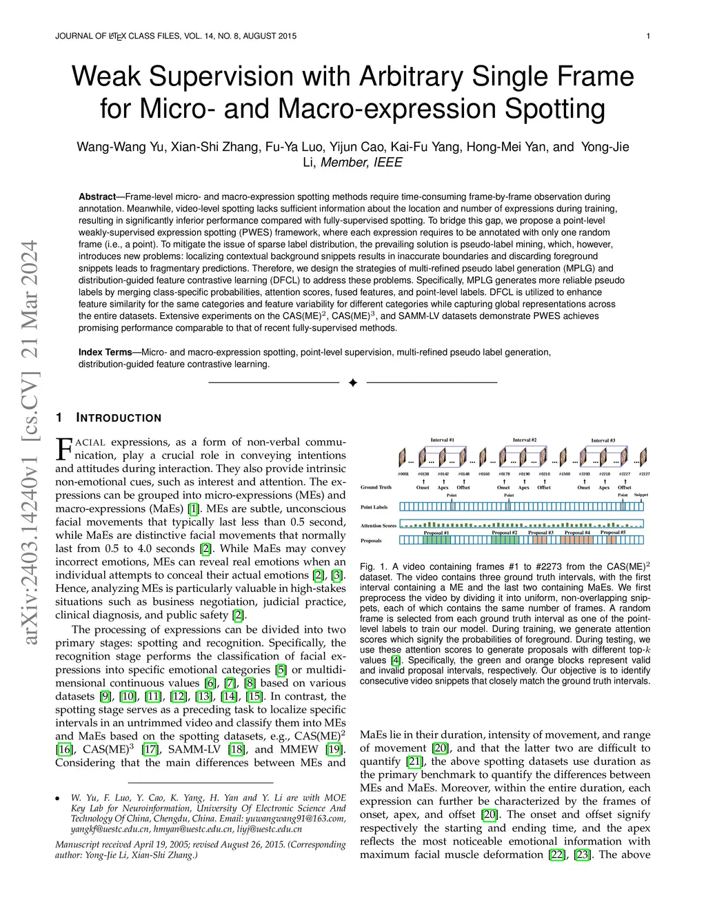 Frame-level micro- and macro-expression spotting methods require time-consuming frame-by-frame observation during annotation. Meanwhile, video-level spotting lacks sufficient information about the location and number of expressions during training, resulting in significantly inferior performance compared with fully-supervised spotting. To bridge this gap, we propose a point-level weakly-supervised expression spotting (PWES) framework, where each expression requires to be annotated with only one random frame (i.e., a point). To mitigate the issue of sparse label distribution, the prevailing solution is pseudo-label mining, which, however, introduces new problems: localizing contextual background snippets results in inaccurate boundaries and discarding foreground snippets leads to fragmentary predictions. Therefore, we design the strategies of multi-refined pseudo label generation (MPLG) and distribution-guided feature contrastive learning (DFCL) to address these problems. Specifically, MPLG generates more reliable pseudo labels by merging class-specific probabilities, attention scores, fused features, and point-level labels. DFCL is utilized to enhance feature similarity for the same categories and feature variability for different categories while capturing global representations across the entire datasets. Extensive experiments on the CAS(ME)^2, CAS(ME)^3, and SAMM-LV datasets demonstrate PWES achieves promising performance comparable to that of recent fully-supervised methods.