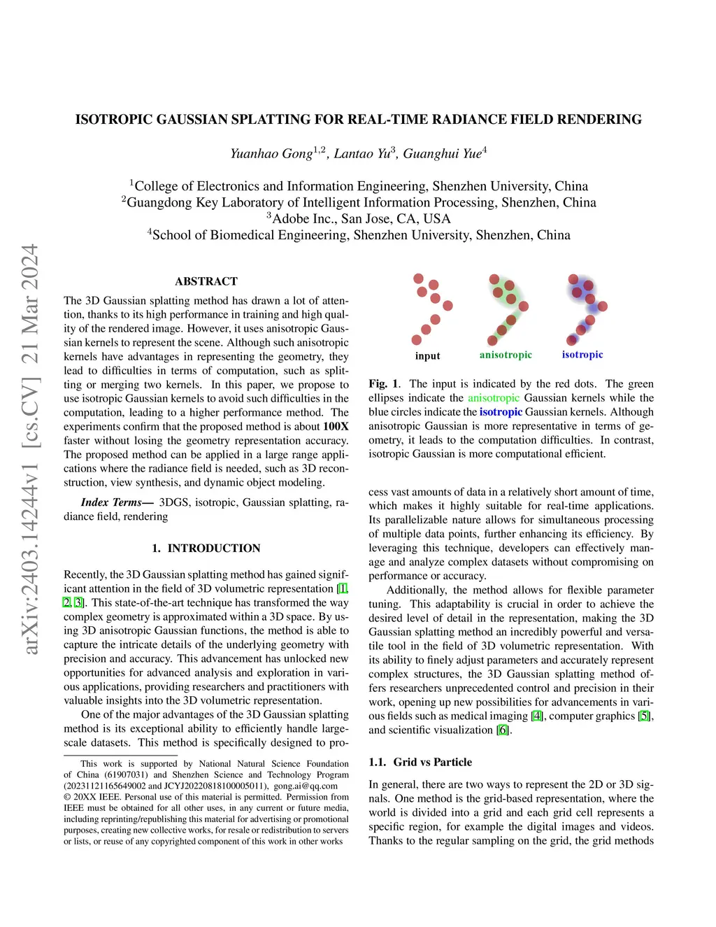 The 3D Gaussian splatting method has drawn a lot of attention, thanks to its high performance in training and high quality of the rendered image. However, it uses anisotropic Gaussian kernels to represent the scene. Although such anisotropic kernels have advantages in representing the geometry, they lead to difficulties in terms of computation, such as splitting or merging two kernels. In this paper, we propose to use isotropic Gaussian kernels to avoid such difficulties in the computation, leading to a higher performance method. The experiments confirm that the proposed method is about {\bf 100X} faster without losing the geometry representation accuracy. The proposed method can be applied in a large range applications where the radiance field is needed, such as 3D reconstruction, view synthesis, and dynamic object modeling.