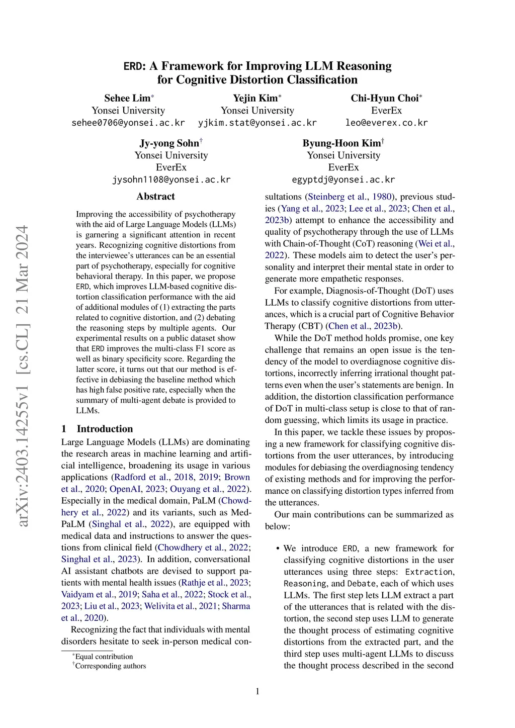 Improving the accessibility of psychotherapy with the aid of Large Language Models (LLMs) is garnering a significant attention in recent years. Recognizing cognitive distortions from the interviewee's utterances can be an essential part of psychotherapy, especially for cognitive behavioral therapy. In this paper, we propose ERD, which improves LLM-based cognitive distortion classification performance with the aid of additional modules of (1) extracting the parts related to cognitive distortion, and (2) debating the reasoning steps by multiple agents. Our experimental results on a public dataset show that ERD improves the multi-class F1 score as well as binary specificity score. Regarding the latter score, it turns out that our method is effective in debiasing the baseline method which has high false positive rate, especially when the summary of multi-agent debate is provided to LLMs.