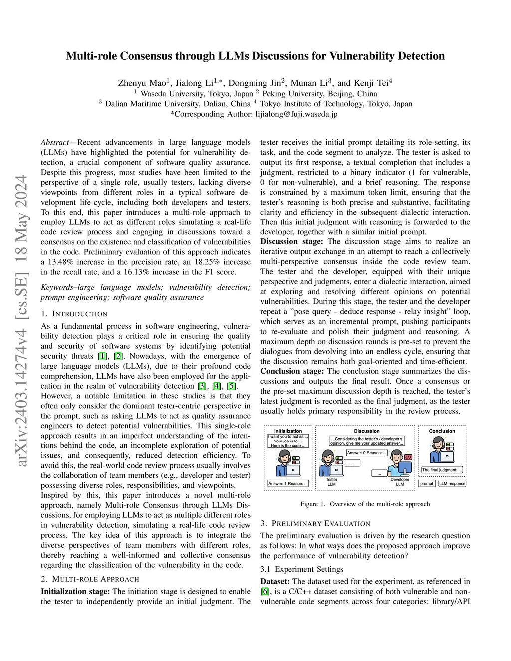 Recent advancements in large language models (LLMs) have highlighted the potential for vulnerability detection, a crucial component of software quality assurance. Despite this progress, most studies have been limited to the perspective of a single role, usually testers, lacking diverse viewpoints from different roles in a typical software development life-cycle, including both developers and testers. To this end, this paper introduces a multi-role approach to employ LLMs to act as different roles simulating a real-life code review process and engaging in discussions toward a consensus on the existence and classification of vulnerabilities in the code. Preliminary evaluation of this approach indicates a 13.48% increase in the precision rate, an 18.25% increase in the recall rate, and a 16.13% increase in the F1 score.