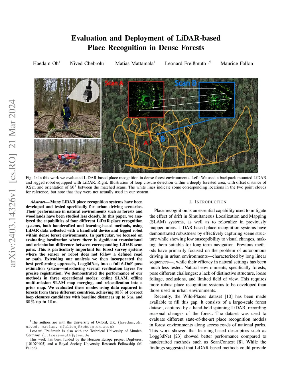 Many LiDAR place recognition systems have been developed and tested specifically for urban driving scenarios. Their performance in natural environments such as forests and woodlands have been studied less closely. In this paper, we analyzed the capabilities of four different LiDAR place recognition systems, both handcrafted and learning-based methods, using LiDAR data collected with a handheld device and legged robot within dense forest environments. In particular, we focused on evaluating localization where there is significant translational and orientation difference between corresponding LiDAR scan pairs. This is particularly important for forest survey systems where the sensor or robot does not follow a defined road or path. Extending our analysis we then incorporated the best performing approach, Logg3dNet, into a full 6-DoF pose estimation system -- introducing several verification layers for precise registration. We demonstrated the performance of our methods in three operational modes: online SLAM, offline multi-mission SLAM map merging, and relocalization into a prior map. We evaluated these modes using data captured in forests from three different countries, achieving 80% of correct loop closures candidates with baseline distances up to 5m, and 60% up to 10m.