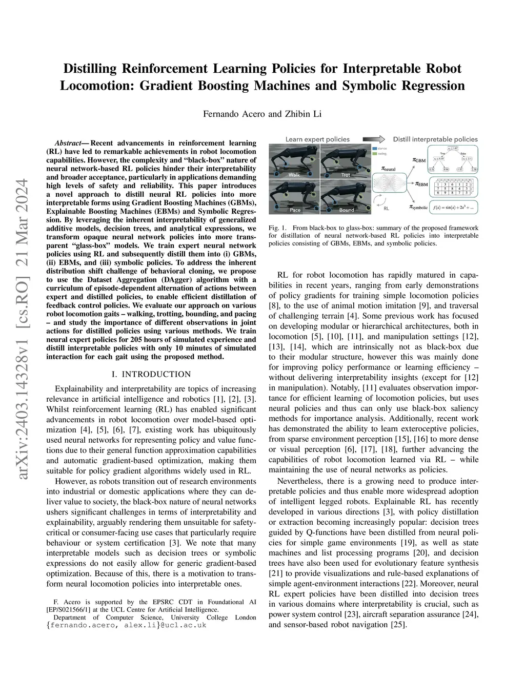Recent advancements in reinforcement learning (RL) have led to remarkable achievements in robot locomotion capabilities. However, the complexity and ``black-box'' nature of neural network-based RL policies hinder their interpretability and broader acceptance, particularly in applications demanding high levels of safety and reliability. This paper introduces a novel approach to distill neural RL policies into more interpretable forms using Gradient Boosting Machines (GBMs), Explainable Boosting Machines (EBMs) and Symbolic Regression. By leveraging the inherent interpretability of generalized additive models, decision trees, and analytical expressions, we transform opaque neural network policies into more transparent ``glass-box'' models. We train expert neural network policies using RL and subsequently distill them into (i) GBMs, (ii) EBMs, and (iii) symbolic policies. To address the inherent distribution shift challenge of behavioral cloning, we propose to use the Dataset Aggregation (DAgger) algorithm with a curriculum of episode-dependent alternation of actions between expert and distilled policies, to enable efficient distillation of feedback control policies. We evaluate our approach on various robot locomotion gaits -- walking, trotting, bounding, and pacing -- and study the importance of different observations in joint actions for distilled policies using various methods. We train neural expert policies for 205 hours of simulated experience and distill interpretable policies with only 10 minutes of simulated interaction for each gait using the proposed method.