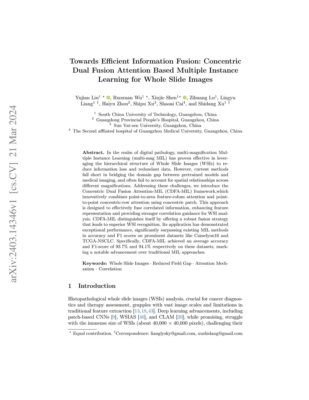 In the realm of digital pathology, multi-magnification Multiple Instance Learning (multi-mag MIL) has proven effective in leveraging the hierarchical structure of Whole Slide Images (WSIs) to reduce information loss and redundant data. However, current methods fall short in bridging the domain gap between pretrained models and medical imaging, and often fail to account for spatial relationships across different magnifications. Addressing these challenges, we introduce the Concentric Dual Fusion Attention-MIL (CDFA-MIL) framework,which innovatively combines point-to-area feature-colum attention and point-to-point concentric-row attention using concentric patch. This approach is designed to effectively fuse correlated information, enhancing feature representation and providing stronger correlation guidance for WSI analysis. CDFA-MIL distinguishes itself by offering a robust fusion strategy that leads to superior WSI recognition. Its application has demonstrated exceptional performance, significantly surpassing existing MIL methods in accuracy and F1 scores on prominent datasets like Camelyon16 and TCGA-NSCLC. Specifically, CDFA-MIL achieved an average accuracy and F1-score of 93.7\% and 94.1\% respectively on these datasets, marking a notable advancement over traditional MIL approaches.