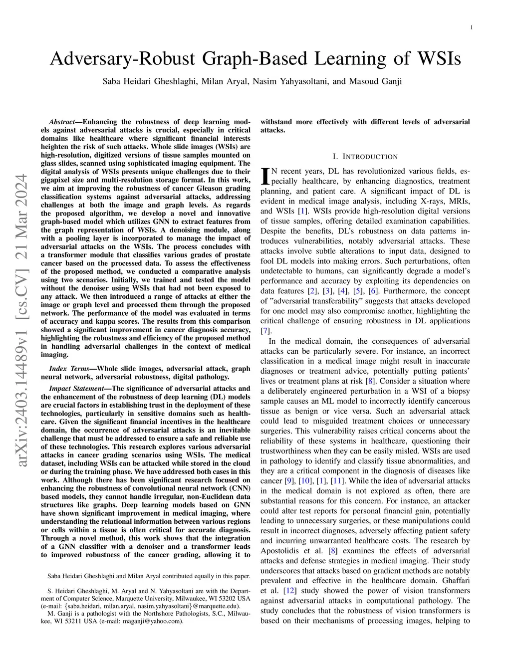 Adversary-Robust Graph-Based Learning of WSIs