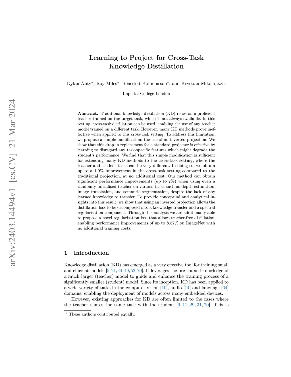 Traditional knowledge distillation (KD) relies on a proficient teacher trained on the target task, which is not always available. In this setting, cross-task distillation can be used, enabling the use of any teacher model trained on a different task. However, many KD methods prove ineffective when applied to this cross-task setting. To address this limitation, we propose a simple modification: the use of an inverted projection. We show that this drop-in replacement for a standard projector is effective by learning to disregard any task-specific features which might degrade the student's performance. We find that this simple modification is sufficient for extending many KD methods to the cross-task setting, where the teacher and student tasks can be very different. In doing so, we obtain up to a 1.9% improvement in the cross-task setting compared to the traditional projection, at no additional cost. Our method can obtain significant performance improvements (up to 7%) when using even a randomly-initialised teacher on various tasks such as depth estimation, image translation, and semantic segmentation, despite the lack of any learned knowledge to transfer. To provide conceptual and analytical insights into this result, we show that using an inverted projection allows the distillation loss to be decomposed into a knowledge transfer and a spectral regularisation component. Through this analysis we are additionally able to propose a novel regularisation loss that allows teacher-free distillation, enabling performance improvements of up to 8.57% on ImageNet with no additional training costs.
