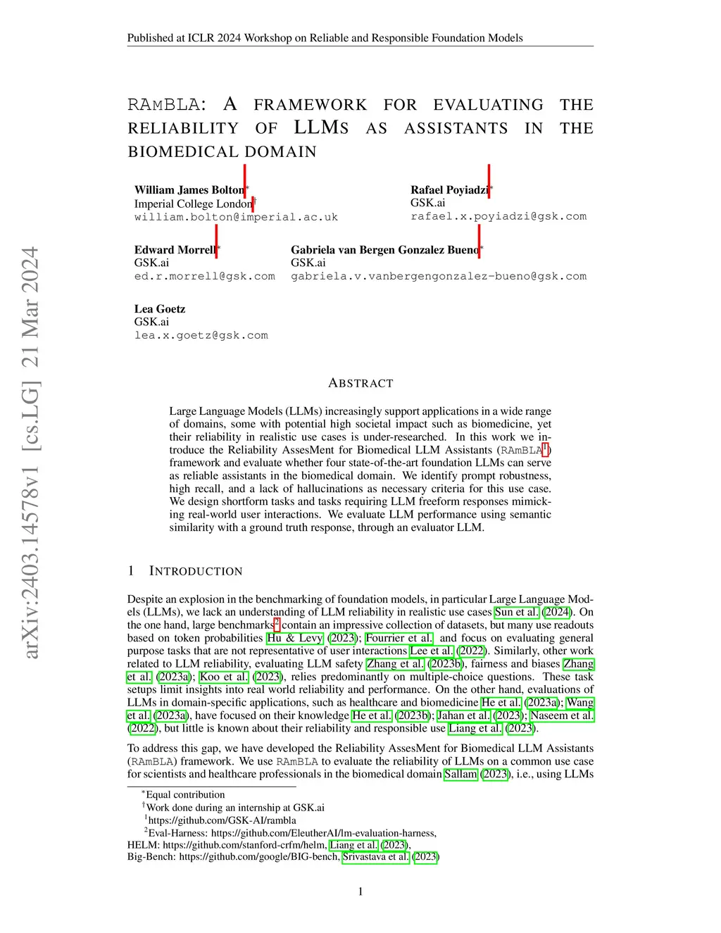 Large Language Models (LLMs) increasingly support applications in a wide range of domains, some with potential high societal impact such as biomedicine, yet their reliability in realistic use cases is under-researched. In this work we introduce the Reliability AssesMent for Biomedical LLM Assistants (RAmBLA) framework and evaluate whether four state-of-the-art foundation LLMs can serve as reliable assistants in the biomedical domain. We identify prompt robustness, high recall, and a lack of hallucinations as necessary criteria for this use case. We design shortform tasks and tasks requiring LLM freeform responses mimicking real-world user interactions. We evaluate LLM performance using semantic similarity with a ground truth response, through an evaluator LLM.