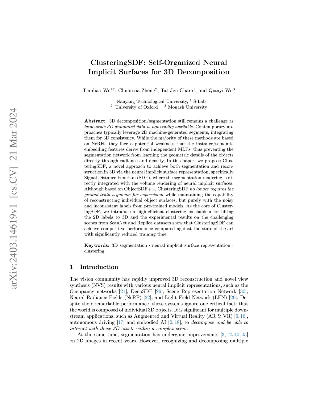 ClusteringSDF: Self-Organized Neural Implicit Surfaces for 3D
