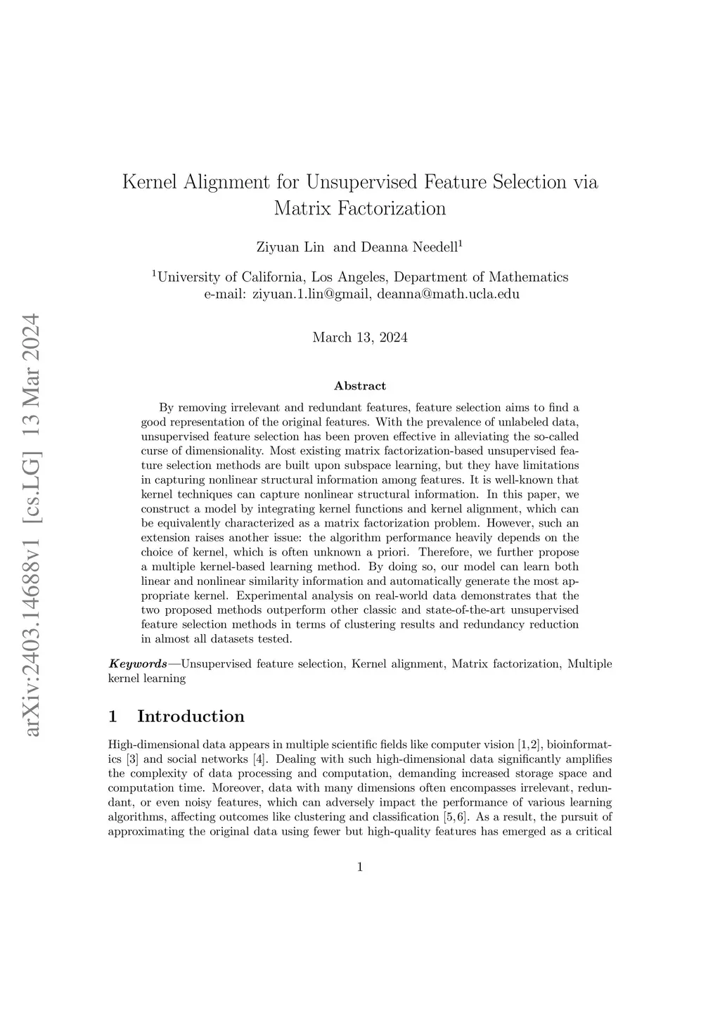 By removing irrelevant and redundant features, feature selection aims to find a good representation of the original features. With the prevalence of unlabeled data, unsupervised feature selection has been proven effective in alleviating the so-called curse of dimensionality. Most existing matrix factorization-based unsupervised feature selection methods are built upon subspace learning, but they have limitations in capturing nonlinear structural information among features. It is well-known that kernel techniques can capture nonlinear structural information. In this paper, we construct a model by integrating kernel functions and kernel alignment, which can be equivalently characterized as a matrix factorization problem. However, such an extension raises another issue: the algorithm performance heavily depends on the choice of kernel, which is often unknown a priori. Therefore, we further propose a multiple kernel-based learning method. By doing so, our model can learn both linear and nonlinear similarity information and automatically generate the most appropriate kernel. Experimental analysis on real-world data demonstrates that the two proposed methods outperform other classic and state-of-the-art unsupervised feature selection methods in terms of clustering results and redundancy reduction in almost all datasets tested.