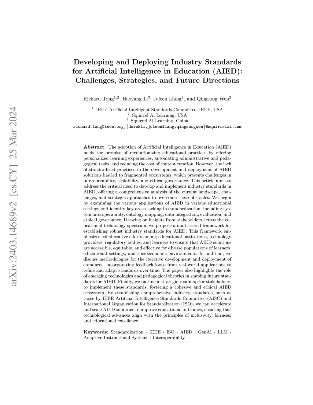 The adoption of Artificial Intelligence in Education (AIED) holds the promise of revolutionizing educational practices by offering personalized learning experiences, automating administrative and pedagogical tasks, and reducing the cost of content creation. However, the lack of standardized practices in the development and deployment of AIED solutions has led to fragmented ecosystems, which presents challenges in interoperability, scalability, and ethical governance. This article aims to address the critical need to develop and implement industry standards in AIED, offering a comprehensive analysis of the current landscape, challenges, and strategic approaches to overcome these obstacles. We begin by examining the various applications of AIED in various educational settings and identify key areas lacking in standardization, including system interoperability, ontology mapping, data integration, evaluation, and ethical governance. Then, we propose a multi-tiered framework for establishing robust industry standards for AIED. In addition, we discuss methodologies for the iterative development and deployment of standards, incorporating feedback loops from real-world applications to refine and adapt standards over time. The paper also highlights the role of emerging technologies and pedagogical theories in shaping future standards for AIED. Finally, we outline a strategic roadmap for stakeholders to implement these standards, fostering a cohesive and ethical AIED ecosystem. By establishing comprehensive industry standards, such as those by IEEE Artificial Intelligence Standards Committee (AISC) and International Organization for Standardization (ISO), we can accelerate and scale AIED solutions to improve educational outcomes, ensuring that technological advances align with the principles of inclusivity, fairness, and educational excellence.