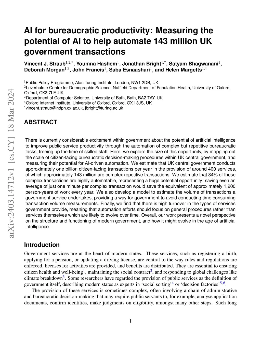 AI for bureaucratic productivity: Measuring the potential of AI to help