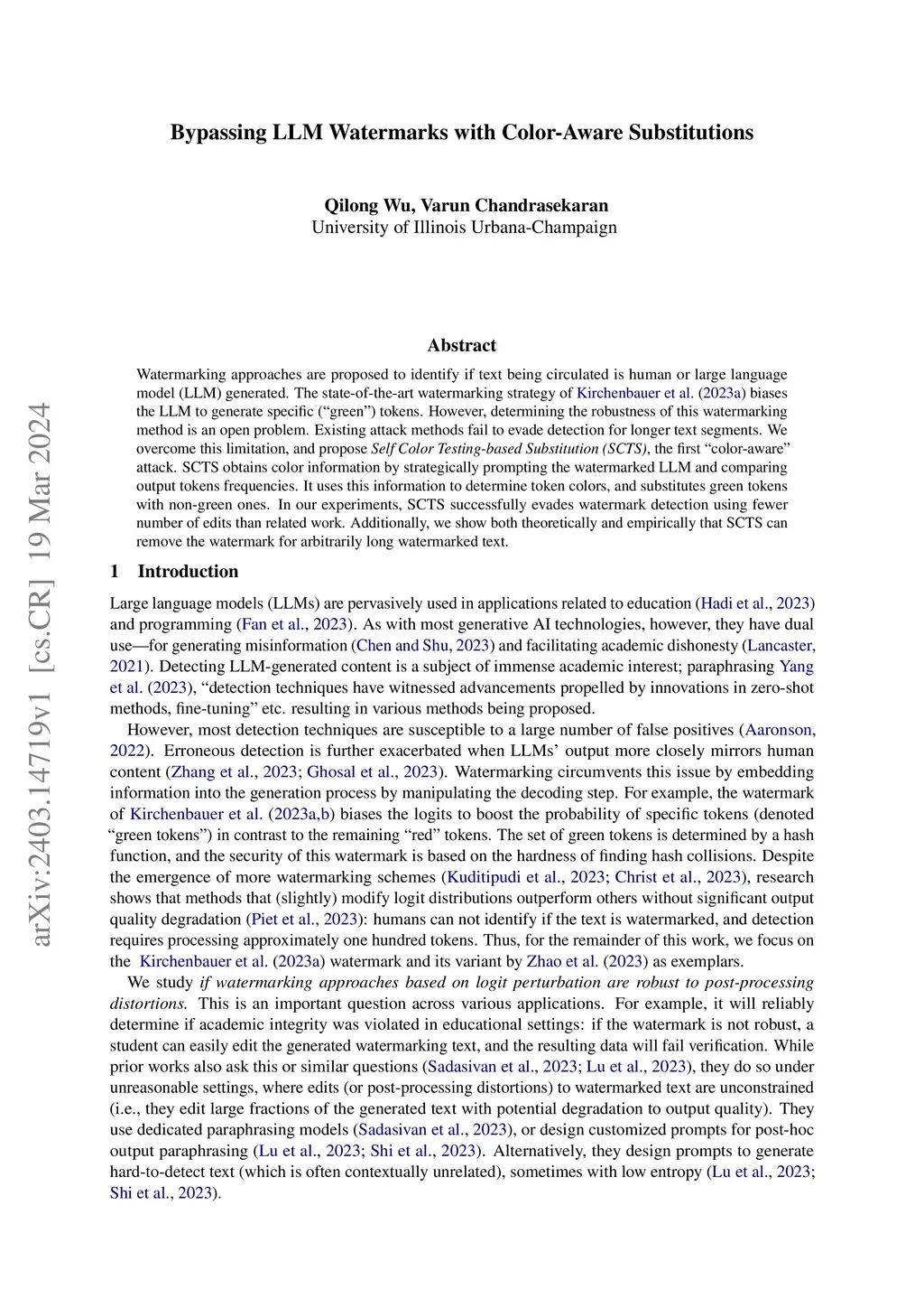 Watermarking approaches are proposed to identify if text being circulated is human or large language model (LLM) generated. The state-of-the-art watermarking strategy of Kirchenbauer et al. (2023a) biases the LLM to generate specific (``green'') tokens. However, determining the robustness of this watermarking method is an open problem. Existing attack methods fail to evade detection for longer text segments. We overcome this limitation, and propose {\em Self Color Testing-based Substitution (SCTS)}, the first ``color-aware'' attack. SCTS obtains color information by strategically prompting the watermarked LLM and comparing output tokens frequencies. It uses this information to determine token colors, and substitutes green tokens with non-green ones. In our experiments, SCTS successfully evades watermark detection using fewer number of edits than related work. Additionally, we show both theoretically and empirically that SCTS can remove the watermark for arbitrarily long watermarked text.
