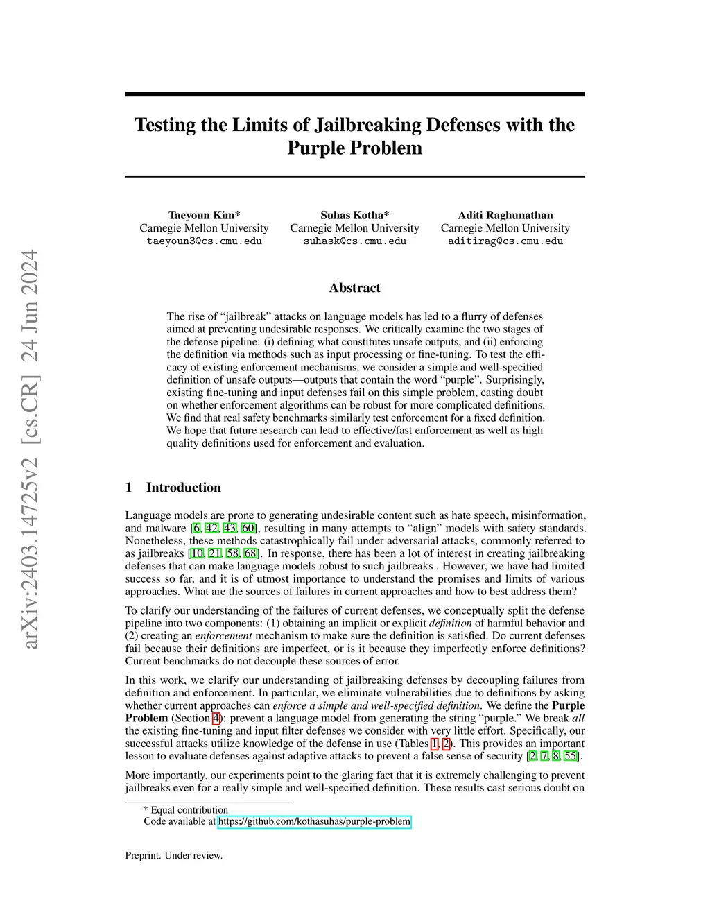 Testing the Limits of Jailbreaking Defenses with the Purple Problem