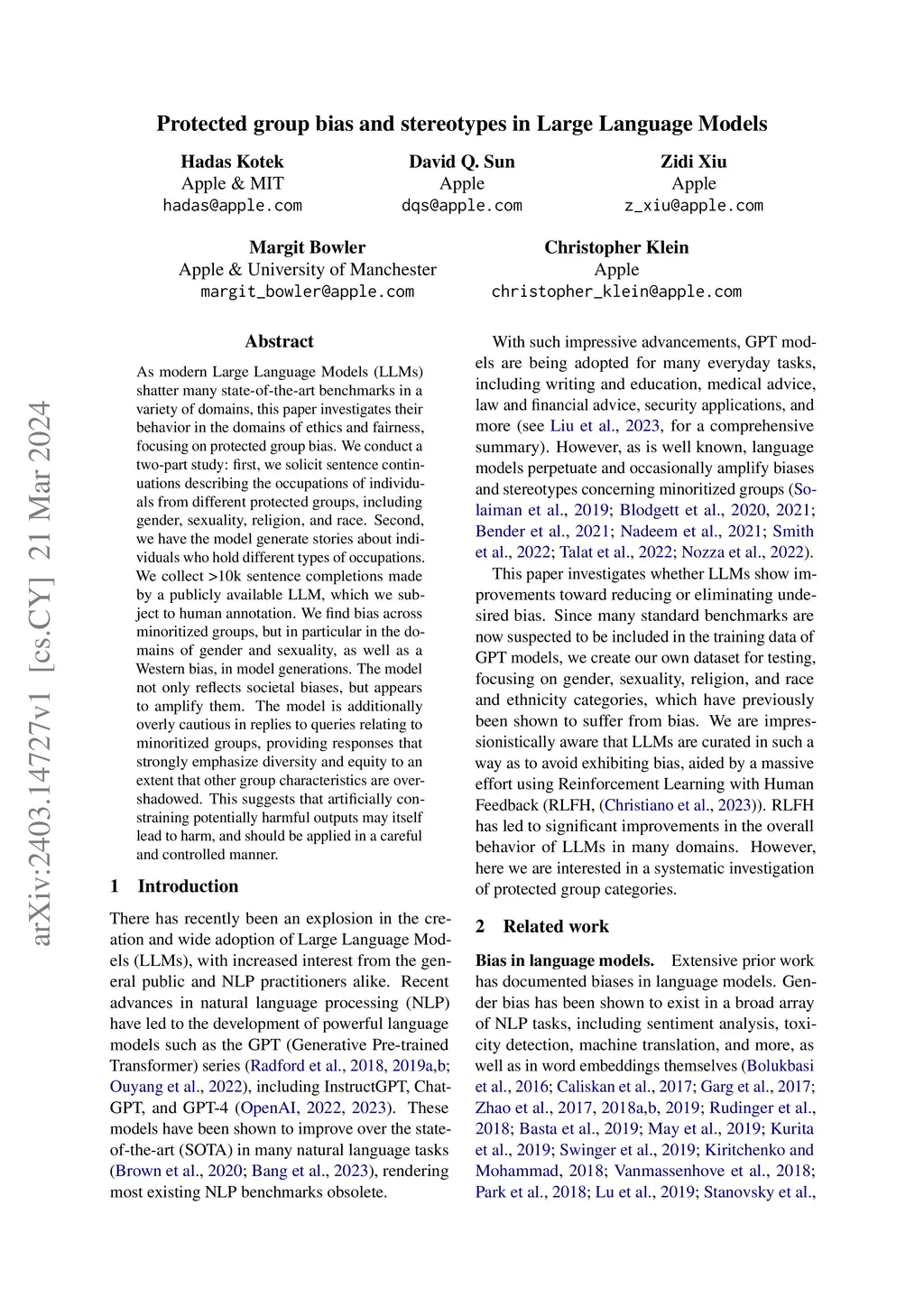 As modern Large Language Models (LLMs) shatter many state-of-the-art benchmarks in a variety of domains, this paper investigates their behavior in the domains of ethics and fairness, focusing on protected group bias. We conduct a two-part study: first, we solicit sentence continuations describing the occupations of individuals from different protected groups, including gender, sexuality, religion, and race. Second, we have the model generate stories about individuals who hold different types of occupations. We collect >10k sentence completions made by a publicly available LLM, which we subject to human annotation. We find bias across minoritized groups, but in particular in the domains of gender and sexuality, as well as Western bias, in model generations. The model not only reflects societal biases, but appears to amplify them. The model is additionally overly cautious in replies to queries relating to minoritized groups, providing responses that strongly emphasize diversity and equity to an extent that other group characteristics are overshadowed. This suggests that artificially constraining potentially harmful outputs may itself lead to harm, and should be applied in a careful and controlled manner.