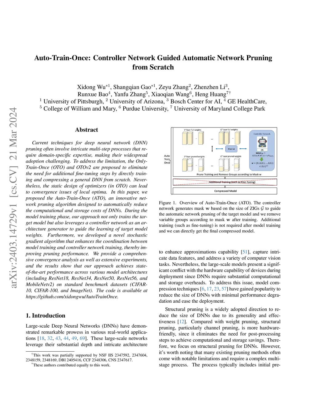 Current techniques for deep neural network (DNN) pruning often involve intricate multi-step processes that require domain-specific expertise, making their widespread adoption challenging. To address the limitation, the Only-Train-Once (OTO) and OTOv2 are proposed to eliminate the need for additional fine-tuning steps by directly training and compressing a general DNN from scratch. Nevertheless, the static design of optimizers (in OTO) can lead to convergence issues of local optima. In this paper, we proposed the Auto-Train-Once (ATO), an innovative network pruning algorithm designed to automatically reduce the computational and storage costs of DNNs. During the model training phase, our approach not only trains the target model but also leverages a controller network as an architecture generator to guide the learning of target model weights. Furthermore, we developed a novel stochastic gradient algorithm that enhances the coordination between model training and controller network training, thereby improving pruning performance. We provide a comprehensive convergence analysis as well as extensive experiments, and the results show that our approach achieves state-of-the-art performance across various model architectures (including ResNet18, ResNet34, ResNet50, ResNet56, and MobileNetv2) on standard benchmark datasets (CIFAR-10, CIFAR-100, and ImageNet).