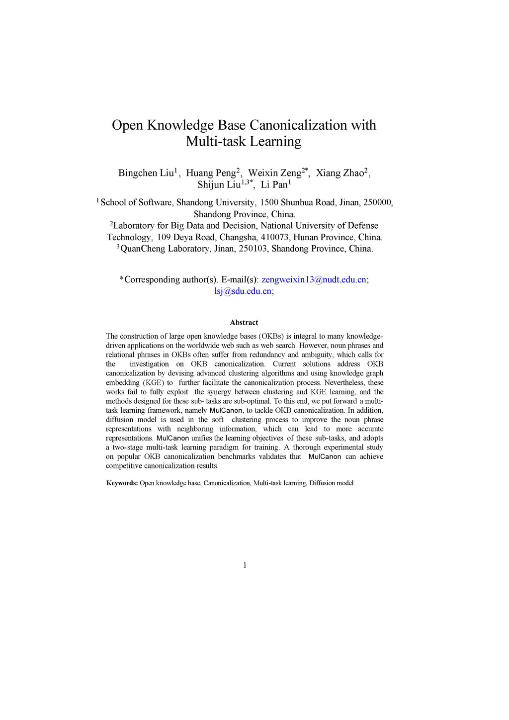 The construction of large open knowledge bases (OKBs) is integral to many knowledge-driven applications on the world wide web such as web search. However, noun phrases and relational phrases in OKBs often suffer from redundancy and ambiguity, which calls for the investigation on OKB canonicalization. Current solutions address OKB canonicalization by devising advanced clustering algorithms and using knowledge graph embedding (KGE) to further facilitate the canonicalization process. Nevertheless, these works fail to fully exploit the synergy between clustering and KGE learning, and the methods designed for these subtasks are sub-optimal. To this end, we put forward a multi-task learning framework, namely MulCanon, to tackle OKB canonicalization. In addition, diffusion model is used in the soft clustering process to improve the noun phrase representations with neighboring information, which can lead to more accurate representations. MulCanon unifies the learning objectives of these sub-tasks, and adopts a two-stage multi-task learning paradigm for training. A thorough experimental study on popular OKB canonicalization benchmarks validates that MulCanon can achieve competitive canonicalization results.