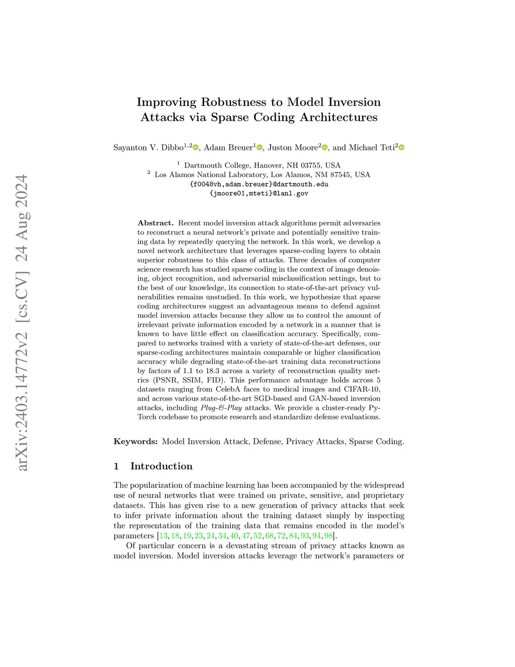 Recent model inversion attack algorithms permit adversaries to reconstruct a neural network's private training data just by repeatedly querying the network and inspecting its outputs. In this work, we develop a novel network architecture that leverages sparse-coding layers to obtain superior robustness to this class of attacks. Three decades of computer science research has studied sparse coding in the context of image denoising, object recognition, and adversarial misclassification settings, but to the best of our knowledge, its connection to state-of-the-art privacy vulnerabilities remains unstudied. However, sparse coding architectures suggest an advantageous means to defend against model inversion attacks because they allow us to control the amount of irrelevant private information encoded in a network's intermediate representations in a manner that can be computed efficiently during training and that is known to have little effect on classification accuracy. Specifically, compared to networks trained with a variety of state-of-the-art defenses, our sparse-coding architectures maintain comparable or higher classification accuracy while degrading state-of-the-art training data reconstructions by factors of 1.1 to 18.3 across a variety of reconstruction quality metrics (PSNR, SSIM, FID). This performance advantage holds across 5 datasets ranging from CelebA faces to medical images and CIFAR-10, and across various state-of-the-art SGD-based and GAN-based inversion attacks, including Plug-&-Play attacks. We provide a cluster-ready PyTorch codebase to promote research and standardize defense evaluations.