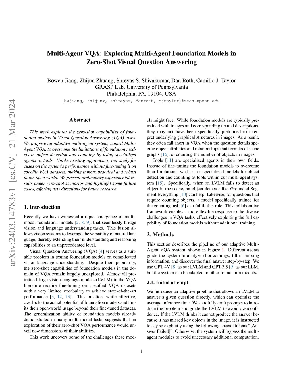 This work explores the zero-shot capabilities of foundation models in Visual Question Answering (VQA) tasks. We propose an adaptive multi-agent system, named Multi-Agent VQA, to overcome the limitations of foundation models in object detection and counting by using specialized agents as tools. Unlike existing approaches, our study focuses on the system's performance without fine-tuning it on specific VQA datasets, making it more practical and robust in the open world. We present preliminary experimental results under zero-shot scenarios and highlight some failure cases, offering new directions for future research.
