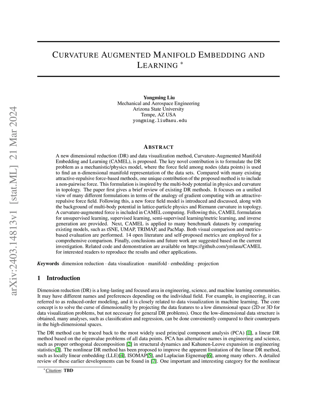 A new dimensional reduction (DR) and data visualization method, Curvature-Augmented Manifold Embedding and Learning (CAMEL), is proposed. The key novel contribution is to formulate the DR problem as a mechanistic/physics model, where the force field among nodes (data points) is used to find an n-dimensional manifold representation of the data sets. Compared with many existing attractive-repulsive force-based methods, one unique contribution of the proposed method is to include a non-pairwise force. A new force field model is introduced and discussed, inspired by the multi-body potential in lattice-particle physics and Riemann curvature in topology. A curvature-augmented force is included in CAMEL. Following this, CAMEL formulation for unsupervised learning, supervised learning, semi-supervised learning/metric learning, and inverse learning are provided. Next, CAMEL is applied to many benchmark datasets by comparing existing models, such as tSNE, UMAP, TRIMAP, and PacMap. Both visual comparison and metrics-based evaluation are performed. 14 open literature and self-proposed metrics are employed for a comprehensive comparison. Conclusions and future work are suggested based on the current investigation. Related code and demonstration are available on https://github.com/ymlasu/CAMEL for interested readers to reproduce the results and other applications.