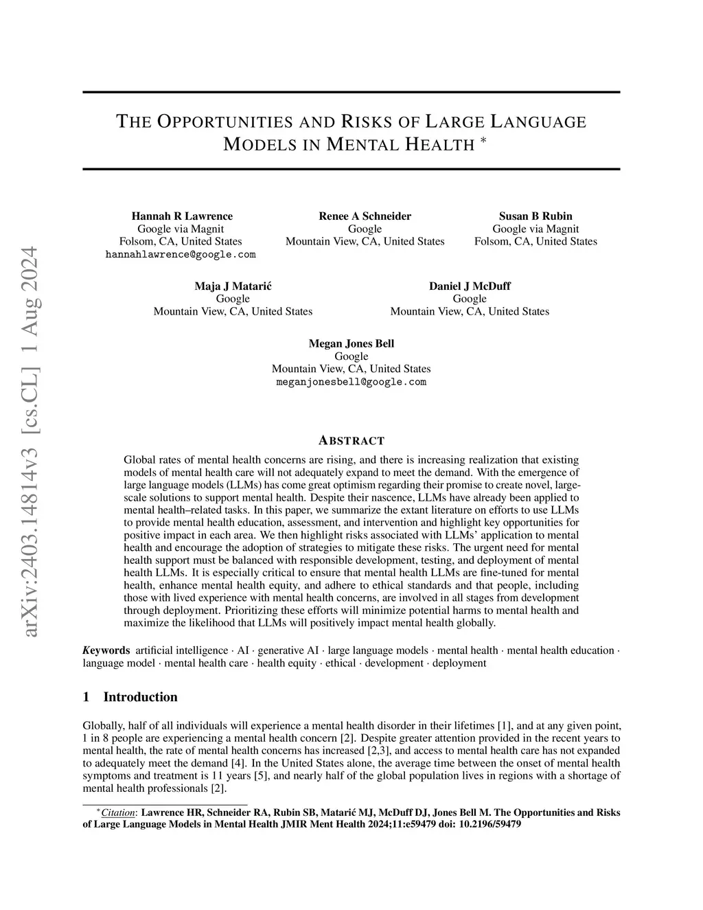Global rates of mental health concerns are rising and there is increasing realization that existing models of mental healthcare will not adequately expand to meet the demand. With the emergence of large language models (LLMs) has come great optimism regarding their promise to create novel, large-scale solutions to support mental health. Despite their nascence, LLMs have already been applied to mental health-related tasks. In this review, we summarize the extant literature on efforts to use LLMs to provide mental health education, assessment, and intervention and highlight key opportunities for positive impact in each area. We then highlight risks associated with LLMs application to mental health and encourage adoption of strategies to mitigate these risks. The urgent need for mental health support must be balanced with responsible development, testing, and deployment of mental health LLMs. Especially critical is ensuring that mental health LLMs are fine-tuned for mental health, enhance mental health equity, adhere to ethical standards, and that people, including those with lived experience with mental health concerns, are involved in all stages from development through deployment. Prioritizing these efforts will minimize potential harms to mental health and maximize the likelihood that LLMs will positively impact mental health globally.
