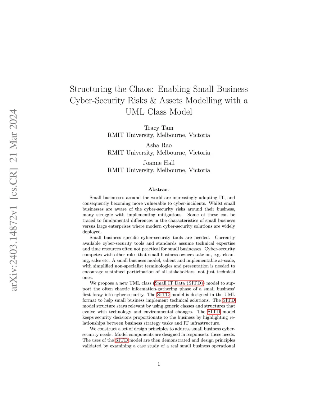 Small businesses are increasingly adopting IT, and consequently becoming more vulnerable to cyber-incidents. Whilst small businesses are aware of the cyber-security risks, many struggle with implementing mitigations. Some of these can be traced to fundamental differences in the characteristics of small business versus large enterprises where modern cyber-security solutions are widely deployed. Small business specific cyber-security tools are needed. Currently available cyber-security tools and standards assume technical expertise and time resources often not practical for small businesses. Cyber-security competes with other roles that small business owners take on, e.g. cleaning, sales etc. A small business model, salient and implementable at-scale, with simplified non-specialist terminologies and presentation is needed to encourage sustained participation of all stakeholders, not just technical ones. We propose a new UML class (Small IT Data (SITD)) model to support the often chaotic information-gathering phase of a small business' first foray into cyber-security. The SITD model is designed in the UML format to help small business implement technical solutions. The SITD model structure stays relevant by using generic classes and structures that evolve with technology and environmental changes. The SITD model keeps security decisions proportionate to the business by highlighting relationships between business strategy tasks and IT infrastructure. We construct a set of design principles to address small business cyber-security needs. Model components are designed in response to these needs. The uses of the SITD model are then demonstrated and design principles validated by examining a case study of a real small business operational and IT information. The SITD model's ability to illustrate breach information is also demonstrated using the NotPetya incident.