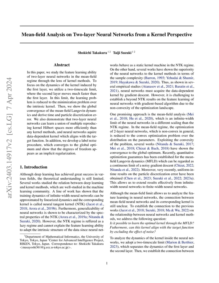 In this paper, we study the feature learning ability of two-layer neural networks in the mean-field regime through the lens of kernel methods. To focus on the dynamics of the kernel induced by the first layer, we utilize a two-timescale limit, where the second layer moves much faster than the first layer. In this limit, the learning problem is reduced to the minimization problem over the intrinsic kernel. Then, we show the global convergence of the mean-field Langevin dynamics and derive time and particle discretization error. We also demonstrate that two-layer neural networks can learn a union of multiple reproducing kernel Hilbert spaces more efficiently than any kernel methods, and neural networks acquire data-dependent kernel which aligns with the target function. In addition, we develop a label noise procedure, which converges to the global optimum and show that the degrees of freedom appears as an implicit regularization.