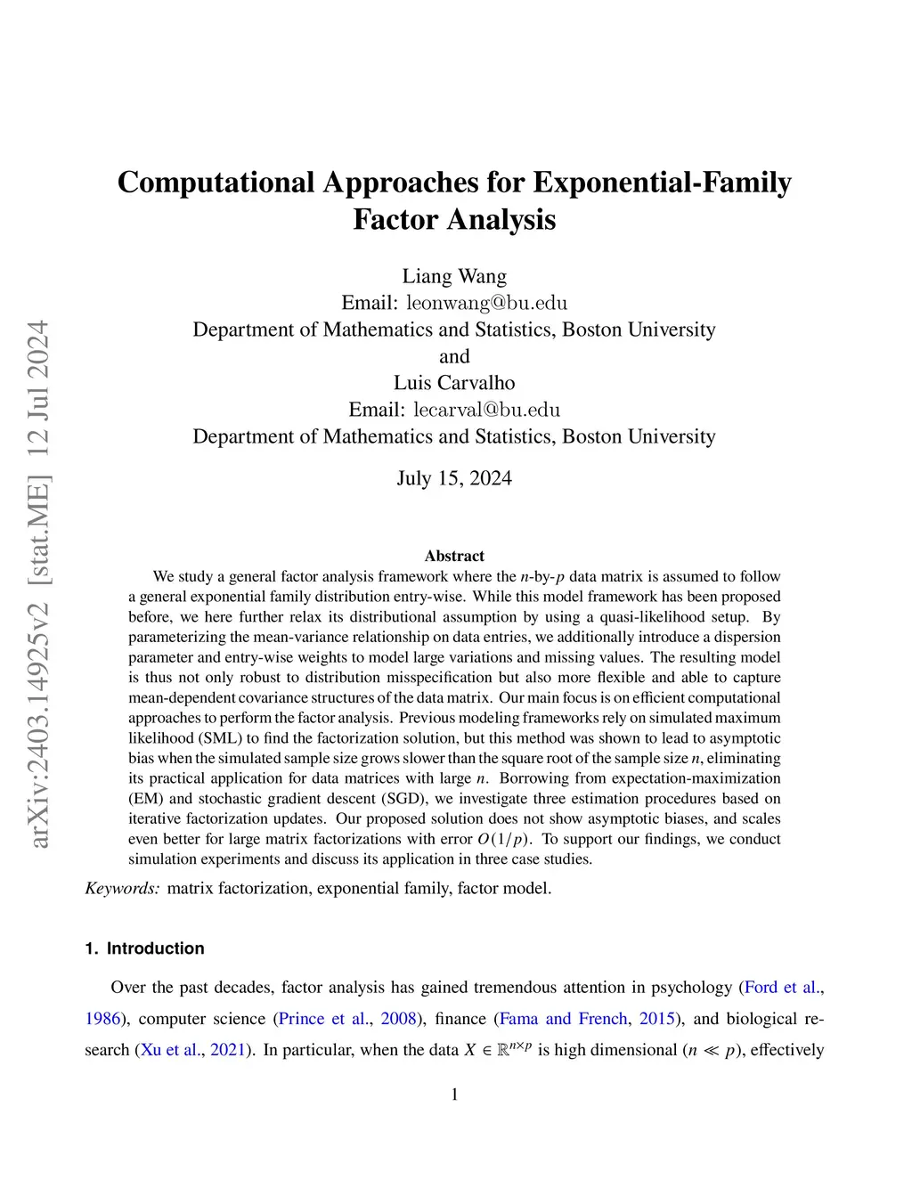 We study a general factor analysis framework where the -by- data matrix is assumed to follow a general exponential family distribution entry-wise. While this model framework has been proposed before, we here further relax its distributional assumption by using a quasi-likelihood setup. By parameterizing the mean-variance relationship on data entries, we additionally introduce a dispersion parameter and entry-wise weights to model large variations and missing values. The resulting model is thus not only robust to distribution misspecification but also more flexible and able to capture non-Gaussian covariance structures of the data matrix. Our main focus is on efficient computational approaches to perform the factor analysis. Previous modeling frameworks rely on simulated maximum likelihood (SML) to find the factorization solution, but this method was shown to lead to asymptotic bias when the simulated sample size grows slower than the square root of the sample size , eliminating its practical application for data matrices with large . Borrowing from expectation-maximization (EM) and stochastic gradient descent (SGD), we investigate three estimation procedures based on iterative factorization updates. Our proposed solution does not show asymptotic biases, and scales even better for large matrix factorizations with error . To support our findings, we conduct simulation experiments and discuss its application in three case studies.