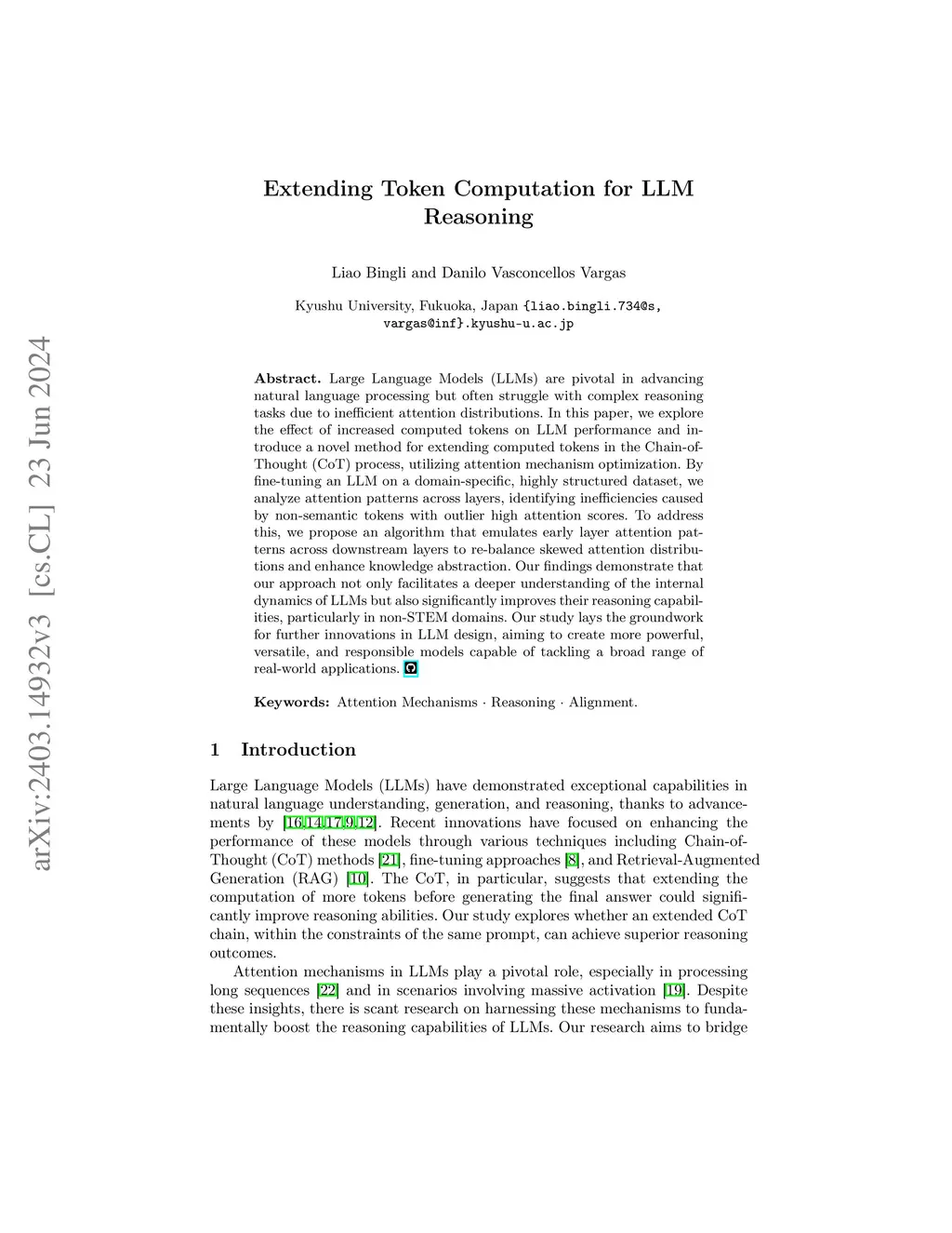 Large Language Models (LLMs) are pivotal in advancing natural language processing but often struggle with complex reasoning tasks due to inefficient attention distributions. In this paper, we explore the effect of increased computed tokens on LLM performance and introduce a novel method for extending computed tokens in the Chain-of-Thought (CoT) process, utilizing attention mechanism optimization. By fine-tuning an LLM on a domain-specific, highly structured dataset, we analyze attention patterns across layers, identifying inefficiencies caused by non-semantic tokens with outlier high attention scores. To address this, we propose an algorithm that emulates early layer attention patterns across downstream layers to re-balance skewed attention distributions and enhance knowledge abstraction. Our findings demonstrate that our approach not only facilitates a deeper understanding of the internal dynamics of LLMs but also significantly improves their reasoning capabilities, particularly in non-STEM domains. Our study lays the groundwork for further innovations in LLM design, aiming to create more powerful, versatile, and responsible models capable of tackling a broad range of real-world applications.