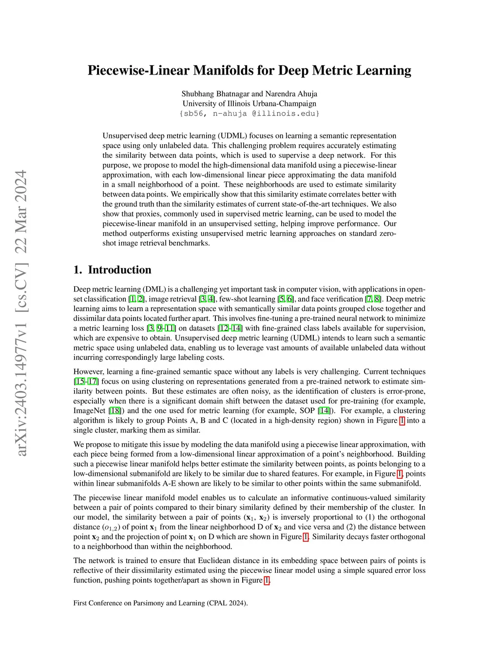 Unsupervised deep metric learning (UDML) focuses on learning a semantic representation space using only unlabeled data. This challenging problem requires accurately estimating the similarity between data points, which is used to supervise a deep network. For this purpose, we propose to model the high-dimensional data manifold using a piecewise-linear approximation, with each low-dimensional linear piece approximating the data manifold in a small neighborhood of a point. These neighborhoods are used to estimate similarity between data points. We empirically show that this similarity estimate correlates better with the ground truth than the similarity estimates of current state-of-the-art techniques. We also show that proxies, commonly used in supervised metric learning, can be used to model the piecewise-linear manifold in an unsupervised setting, helping improve performance. Our method outperforms existing unsupervised metric learning approaches on standard zero-shot image retrieval benchmarks.
