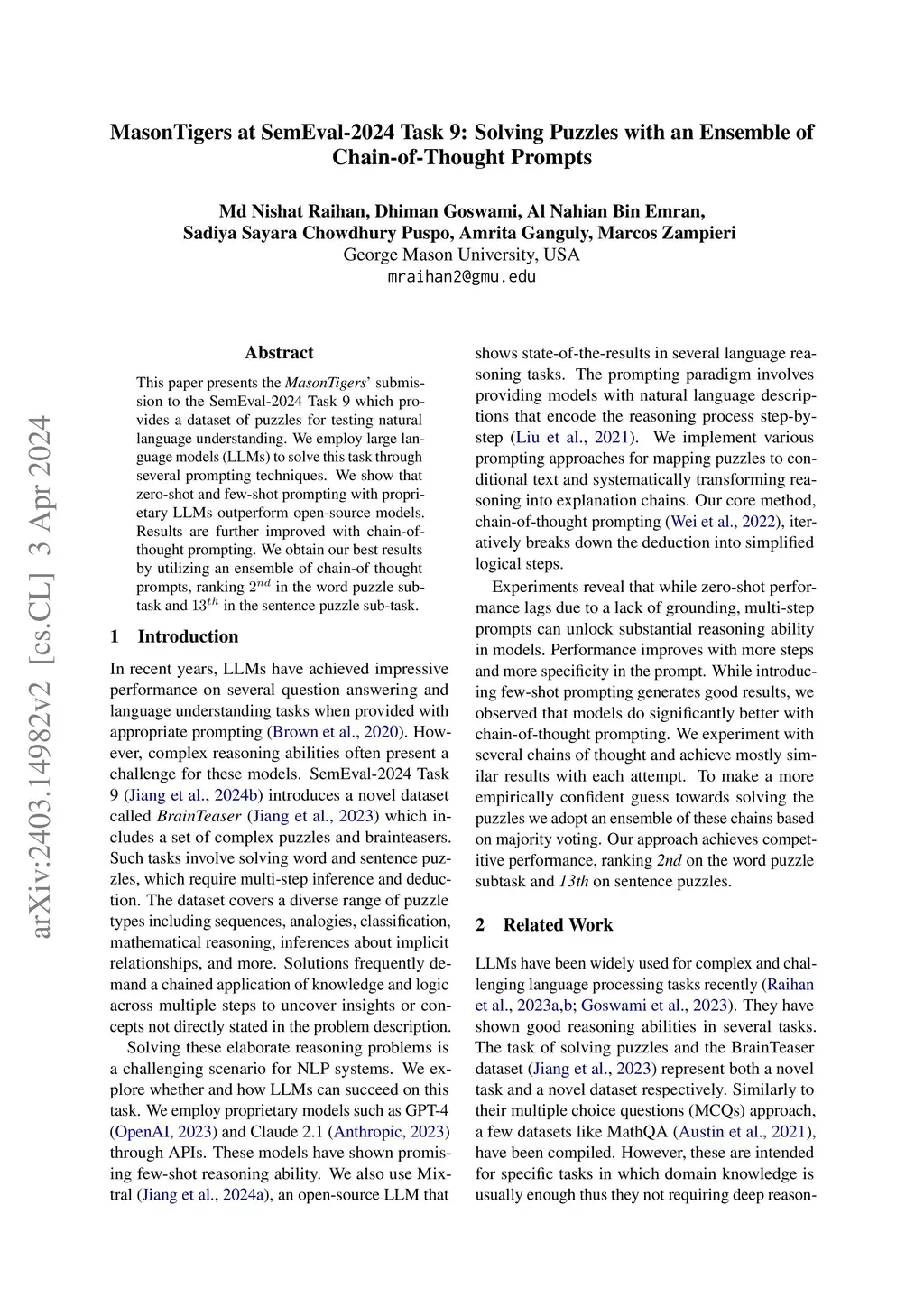 Our paper presents team MasonTigers submission to the SemEval-2024 Task 9 - which provides a dataset of puzzles for testing natural language understanding. We employ large language models (LLMs) to solve this task through several prompting techniques. Zero-shot and few-shot prompting generate reasonably good results when tested with proprietary LLMs, compared to the open-source models. We obtain further improved results with chain-of-thought prompting, an iterative prompting method that breaks down the reasoning process step-by-step. We obtain our best results by utilizing an ensemble of chain-of-thought prompts, placing 2nd in the word puzzle subtask and 13th in the sentence puzzle subtask. The strong performance of prompted LLMs demonstrates their capability for complex reasoning when provided with a decomposition of the thought process. Our work sheds light on how step-wise explanatory prompts can unlock more of the knowledge encoded in the parameters of large models.