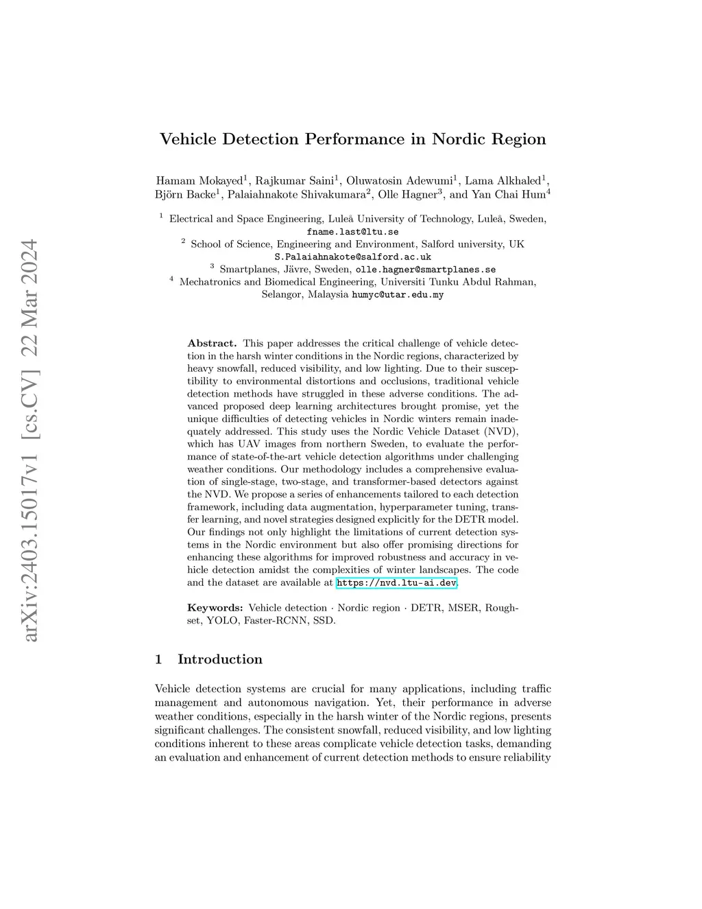 This paper addresses the critical challenge of vehicle detection in the harsh winter conditions in the Nordic regions, characterized by heavy snowfall, reduced visibility, and low lighting. Due to their susceptibility to environmental distortions and occlusions, traditional vehicle detection methods have struggled in these adverse conditions. The advanced proposed deep learning architectures brought promise, yet the unique difficulties of detecting vehicles in Nordic winters remain inadequately addressed. This study uses the Nordic Vehicle Dataset (NVD), which has UAV images from northern Sweden, to evaluate the performance of state-of-the-art vehicle detection algorithms under challenging weather conditions. Our methodology includes a comprehensive evaluation of single-stage, two-stage, and transformer-based detectors against the NVD. We propose a series of enhancements tailored to each detection framework, including data augmentation, hyperparameter tuning, transfer learning, and novel strategies designed explicitly for the DETR model. Our findings not only highlight the limitations of current detection systems in the Nordic environment but also offer promising directions for enhancing these algorithms for improved robustness and accuracy in vehicle detection amidst the complexities of winter landscapes. The code and the dataset are available at https://nvd.ltu-ai.dev