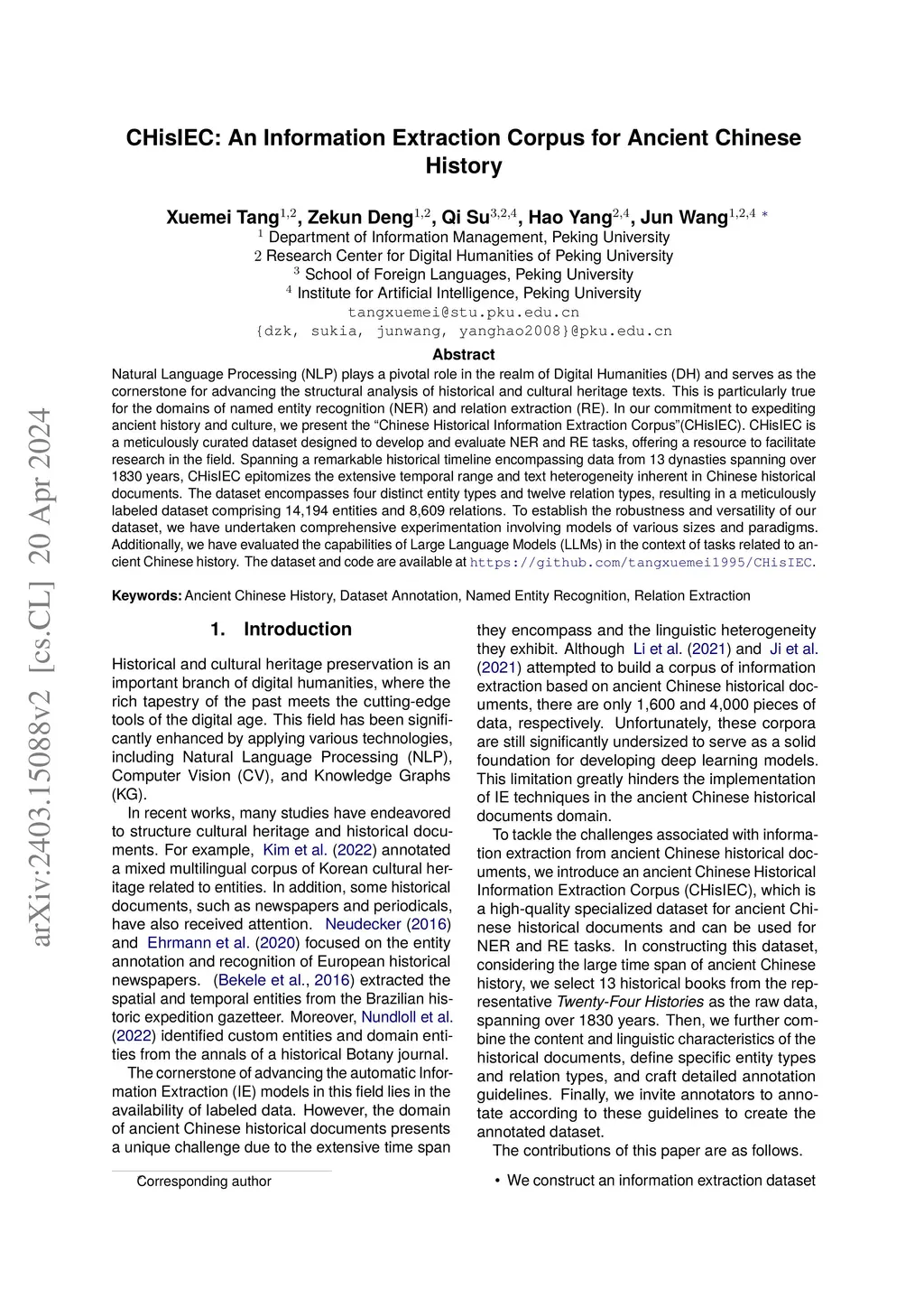 Natural Language Processing (NLP) plays a pivotal role in the realm of Digital Humanities (DH) and serves as the cornerstone for advancing the structural analysis of historical and cultural heritage texts. This is particularly true for the domains of named entity recognition (NER) and relation extraction (RE). In our commitment to expediting ancient history and culture, we present the ``Chinese Historical Information Extraction Corpus''(CHisIEC). CHisIEC is a meticulously curated dataset designed to develop and evaluate NER and RE tasks, offering a resource to facilitate research in the field. Spanning a remarkable historical timeline encompassing data from 13 dynasties spanning over 1830 years, CHisIEC epitomizes the extensive temporal range and text heterogeneity inherent in Chinese historical documents. The dataset encompasses four distinct entity types and twelve relation types, resulting in a meticulously labeled dataset comprising 14,194 entities and 8,609 relations. To establish the robustness and versatility of our dataset, we have undertaken comprehensive experimentation involving models of various sizes and paradigms. Additionally, we have evaluated the capabilities of Large Language Models (LLMs) in the context of tasks related to ancient Chinese history. The dataset and code are available at \url{https://github.com/tangxuemei1995/CHisIEC}.
