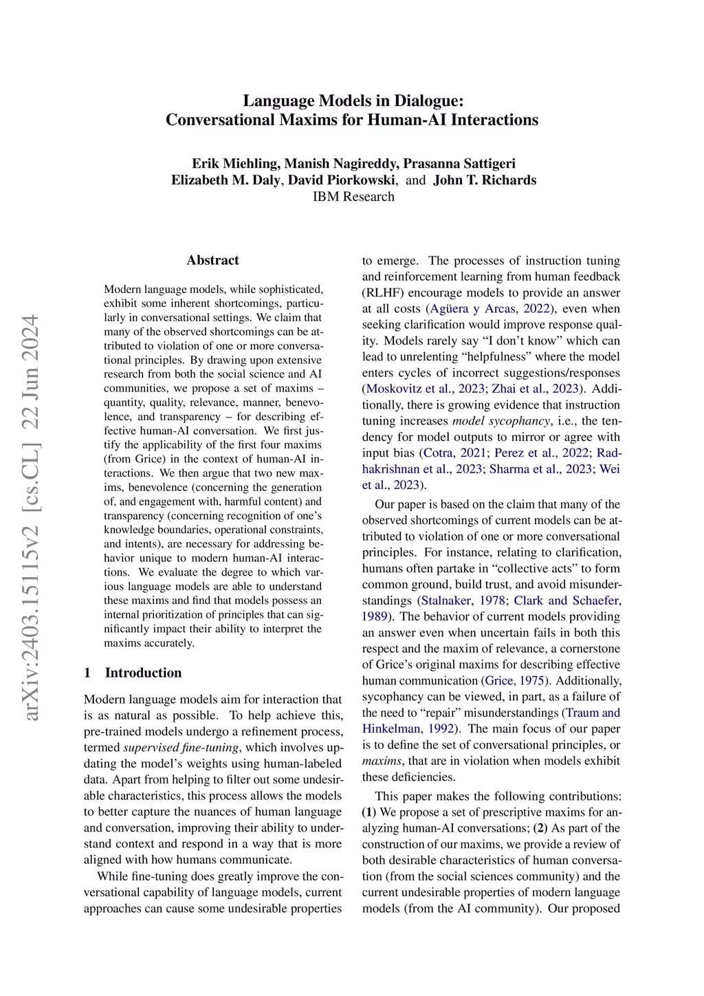 Modern language models, while sophisticated, exhibit some inherent shortcomings, particularly in conversational settings. We claim that many of the observed shortcomings can be attributed to violation of one or more conversational principles. By drawing upon extensive research from both the social science and AI communities, we propose a set of maxims -- quantity, quality, relevance, manner, benevolence, and transparency -- for describing effective human-AI conversation. We first justify the applicability of the first four maxims (from Grice) in the context of human-AI interactions. We then argue that two new maxims, benevolence (concerning the generation of, and engagement with, harmful content) and transparency (concerning recognition of one's knowledge boundaries, operational constraints, and intents), are necessary for addressing behavior unique to modern human-AI interactions. We evaluate the degree to which various language models are able to understand these maxims and find that models possess an internal prioritization of principles that can significantly impact their ability to interpret the maxims accurately.