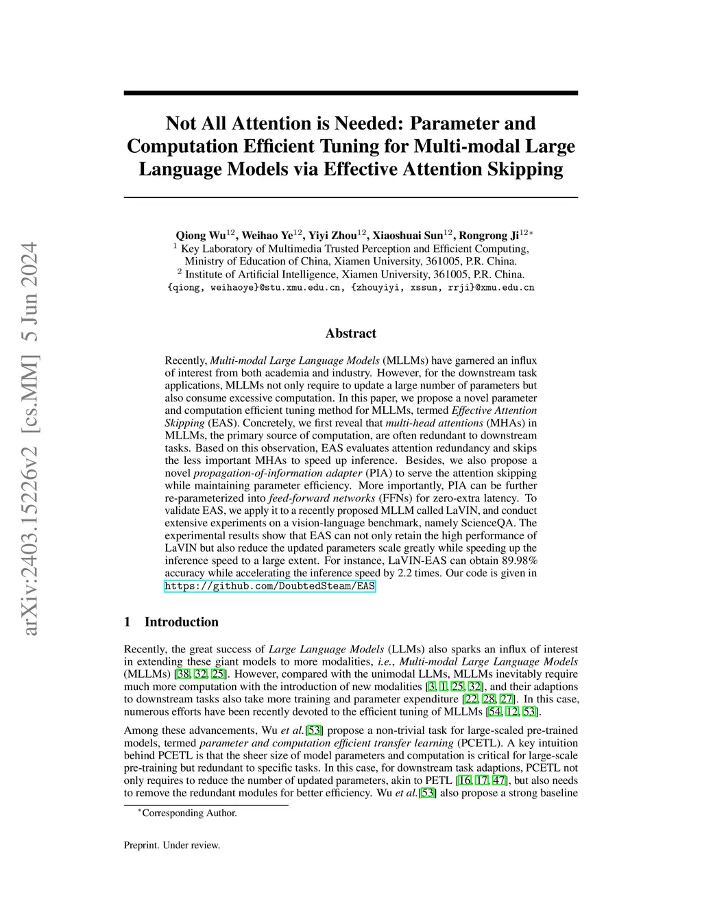 In this paper, we propose a novel parameter and computation efficient tuning method for Multi-modal Large Language Models (MLLMs), termed Efficient Attention Skipping (EAS). Concretely, we first reveal that multi-head attentions (MHAs), the main computational overhead of MLLMs, are often redundant to downstream tasks. Based on this observation, EAS evaluates the attention redundancy and skips the less important MHAs to speed up inference. Besides, we also propose a novel propagation-of-information adapter (PIA) to serve the attention skipping of EAS and keep parameter efficiency, which can be further re-parameterized into feed-forward networks (FFNs) for zero-extra latency. To validate EAS, we apply it to a recently proposed MLLM called LaVIN and a classic VL pre-trained model called METER, and conduct extensive experiments on a set of benchmarks. The experiments show that EAS not only retains high performance and parameter efficiency, but also greatly speeds up inference speed. For instance, LaVIN-EAS can obtain 89.98\% accuracy on ScineceQA while speeding up inference by 2.2 times to LaVIN