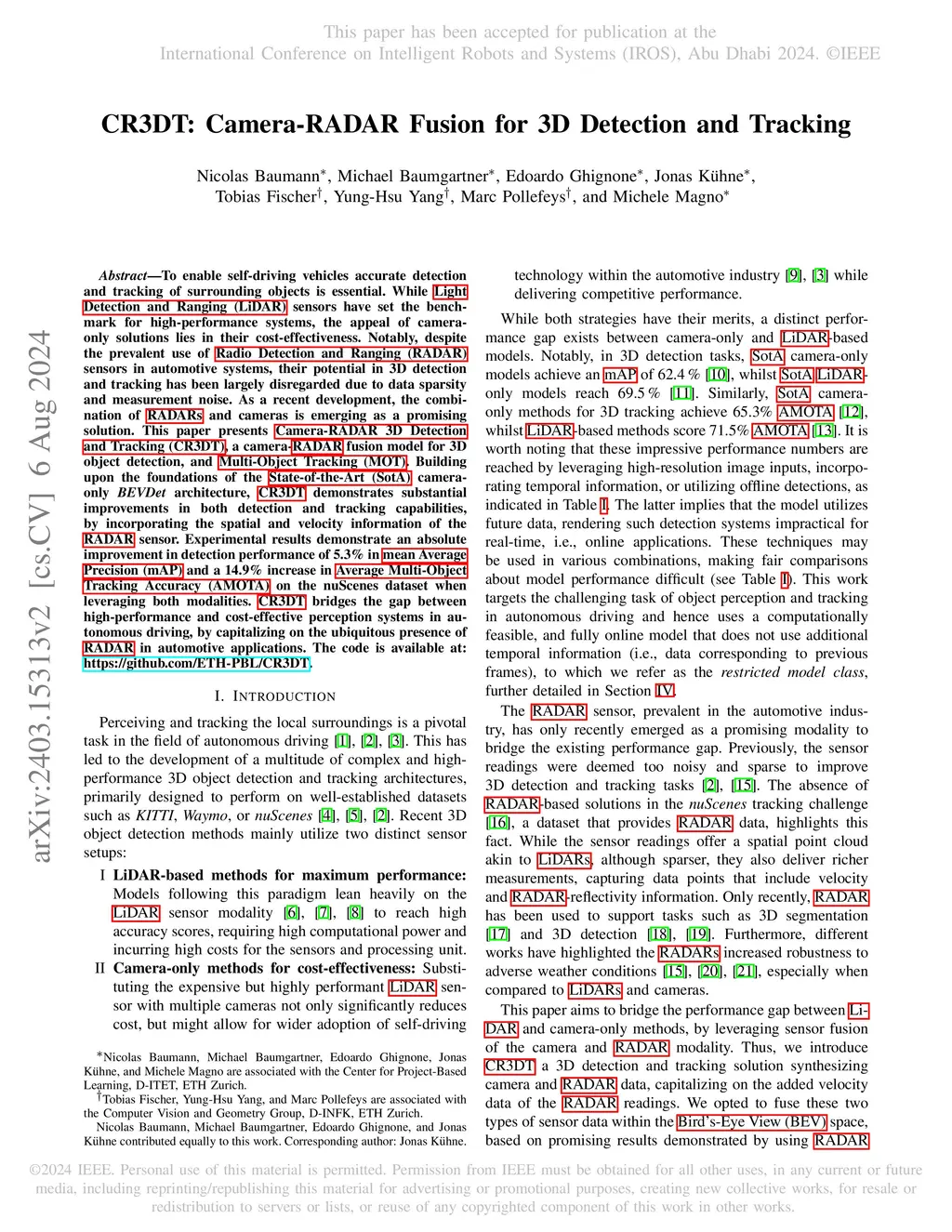CR3DT: Camera-RADAR Fusion for 3D Detection and Tracking
