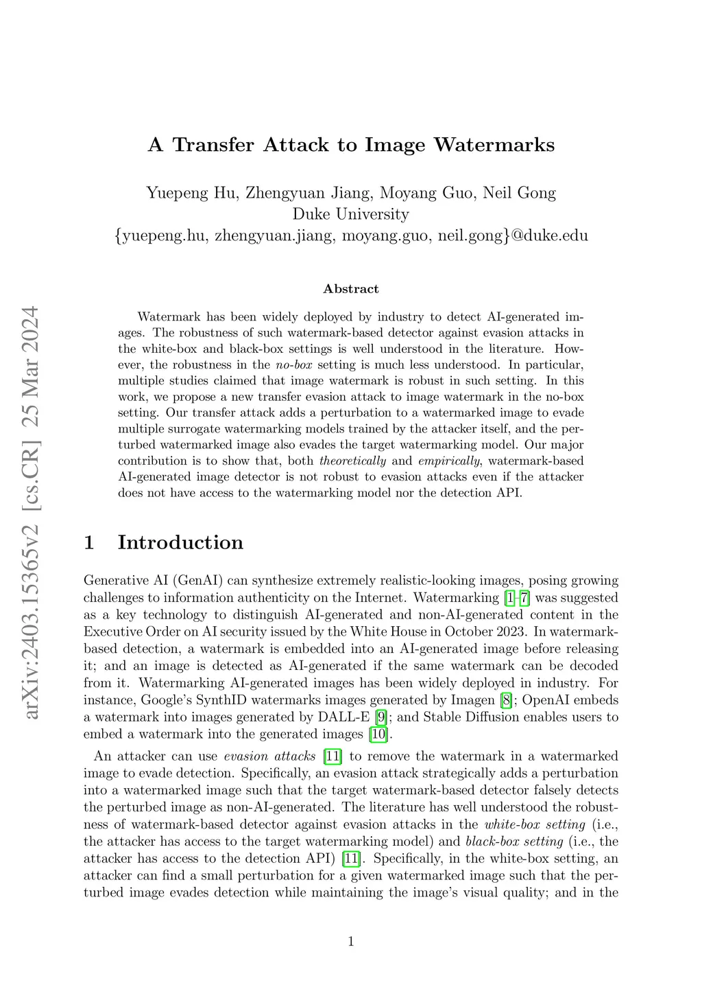 Watermark has been widely deployed by industry to detect AI-generated images. The robustness of such watermark-based detector against evasion attacks in the white-box and black-box settings is well understood in the literature. However, the robustness in the no-box setting is much less understood. In this work, we propose a new transfer evasion attack to image watermark in the no-box setting. Our transfer attack adds a perturbation to a watermarked image to evade multiple surrogate watermarking models trained by the attacker itself, and the perturbed watermarked image also evades the target watermarking model. Our major contribution is to show that, both theoretically and empirically, watermark-based AI-generated image detector based on existing watermarking methods is not robust to evasion attacks even if the attacker does not have access to the watermarking model nor the detection API. Our code is available at:this https URL.