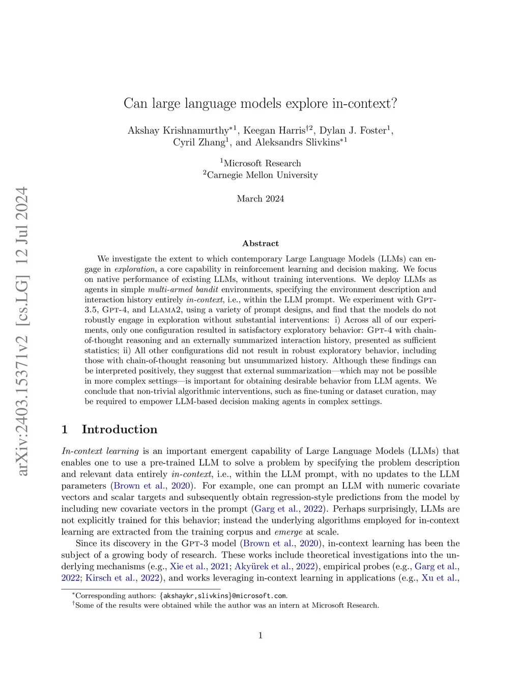Can large language models explore in-context?