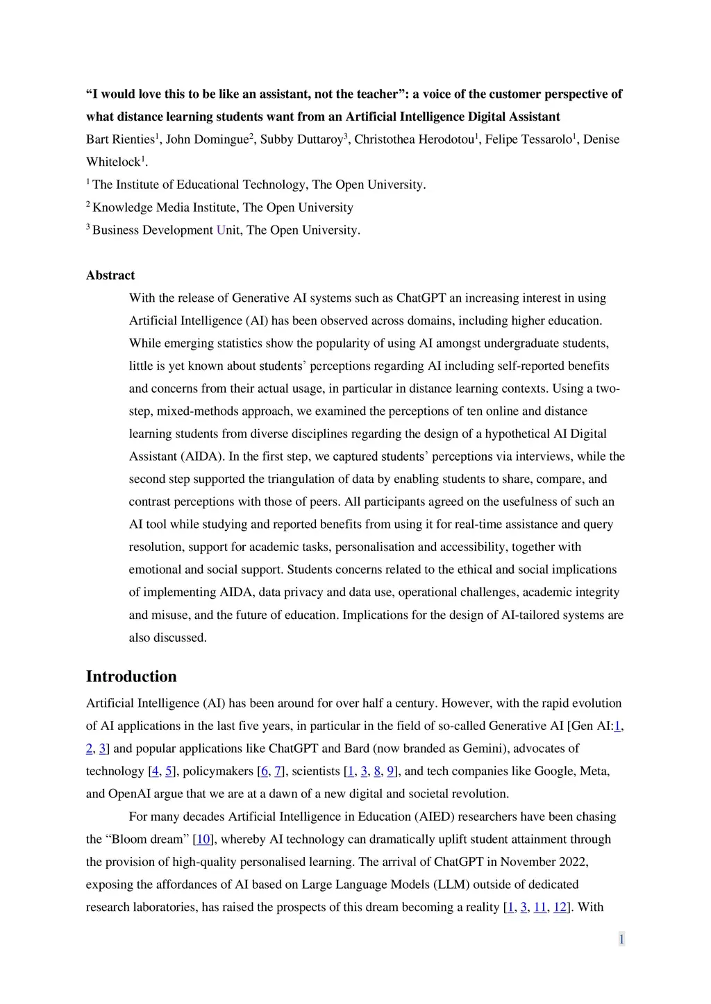 With the release of Generative AI systems such as ChatGPT, an increasing interest in using Artificial Intelligence (AI) has been observed across domains, including higher education. While emerging statistics show the popularity of using AI amongst undergraduate students, little is yet known about students' perceptions regarding AI including self-reported benefits and concerns from their actual usage, in particular in distance learning contexts. Using a two-step, mixed-methods approach, we examined the perceptions of ten online and distance learning students from diverse disciplines regarding the design of a hypothetical AI Digital Assistant (AIDA). In the first step, we captured students' perceptions via interviews, while the second step supported the triangulation of data by enabling students to share, compare, and contrast perceptions with those of peers. All participants agreed on the usefulness of such an AI tool while studying and reported benefits from using it for real-time assistance and query resolution, support for academic tasks, personalisation and accessibility, together with emotional and social support. Students' concerns related to the ethical and social implications of implementing AIDA, data privacy and data use, operational challenges, academic integrity and misuse, and the future of education. Implications for the design of AI-tailored systems are also discussed.