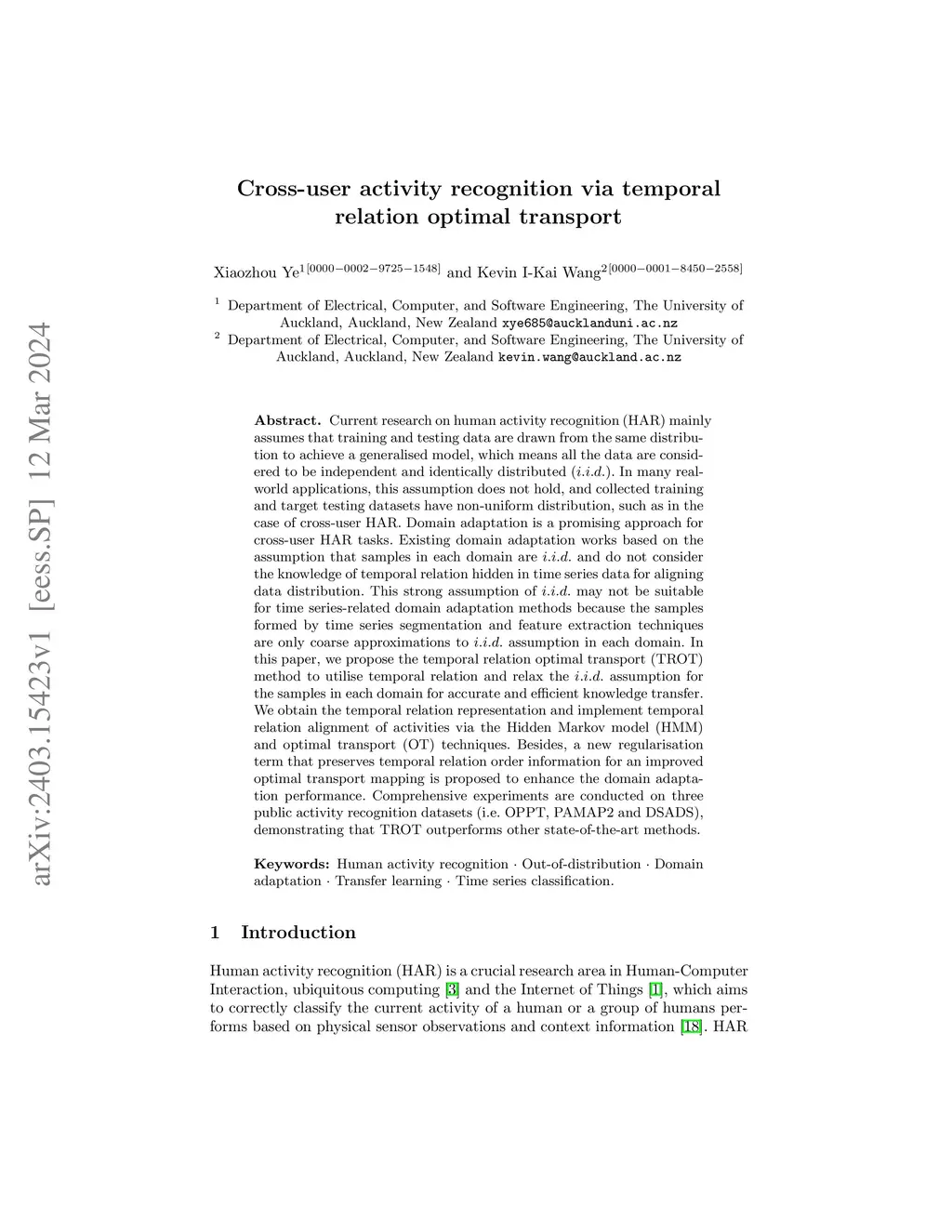 Current research on human activity recognition (HAR) mainly assumes that training and testing data are drawn from the same distribution to achieve a generalised model, which means all the data are considered to be independent and identically distributed $\displaystyle (i.i.d.) $. In many real-world applications, this assumption does not hold, and collected training and target testing datasets have non-uniform distribution, such as in the case of cross-user HAR. Domain adaptation is a promising approach for cross-user HAR tasks. Existing domain adaptation works based on the assumption that samples in each domain are $\displaystyle i.i.d. $ and do not consider the knowledge of temporal relation hidden in time series data for aligning data distribution. This strong assumption of $\displaystyle i.i.d. $ may not be suitable for time series-related domain adaptation methods because the samples formed by time series segmentation and feature extraction techniques are only coarse approximations to $\displaystyle i.i.d. $ assumption in each domain. In this paper, we propose the temporal relation optimal transport (TROT) method to utilise temporal relation and relax the $\displaystyle i.i.d. $ assumption for the samples in each domain for accurate and efficient knowledge transfer. We obtain the temporal relation representation and implement temporal relation alignment of activities via the Hidden Markov model (HMM) and optimal transport (OT) techniques. Besides, a new regularisation term that preserves temporal relation order information for an improved optimal transport mapping is proposed to enhance the domain adaptation performance. Comprehensive experiments are conducted on three public activity recognition datasets (i.e. OPPT, PAMAP2 and DSADS), demonstrating that TROT outperforms other state-of-the-art methods.