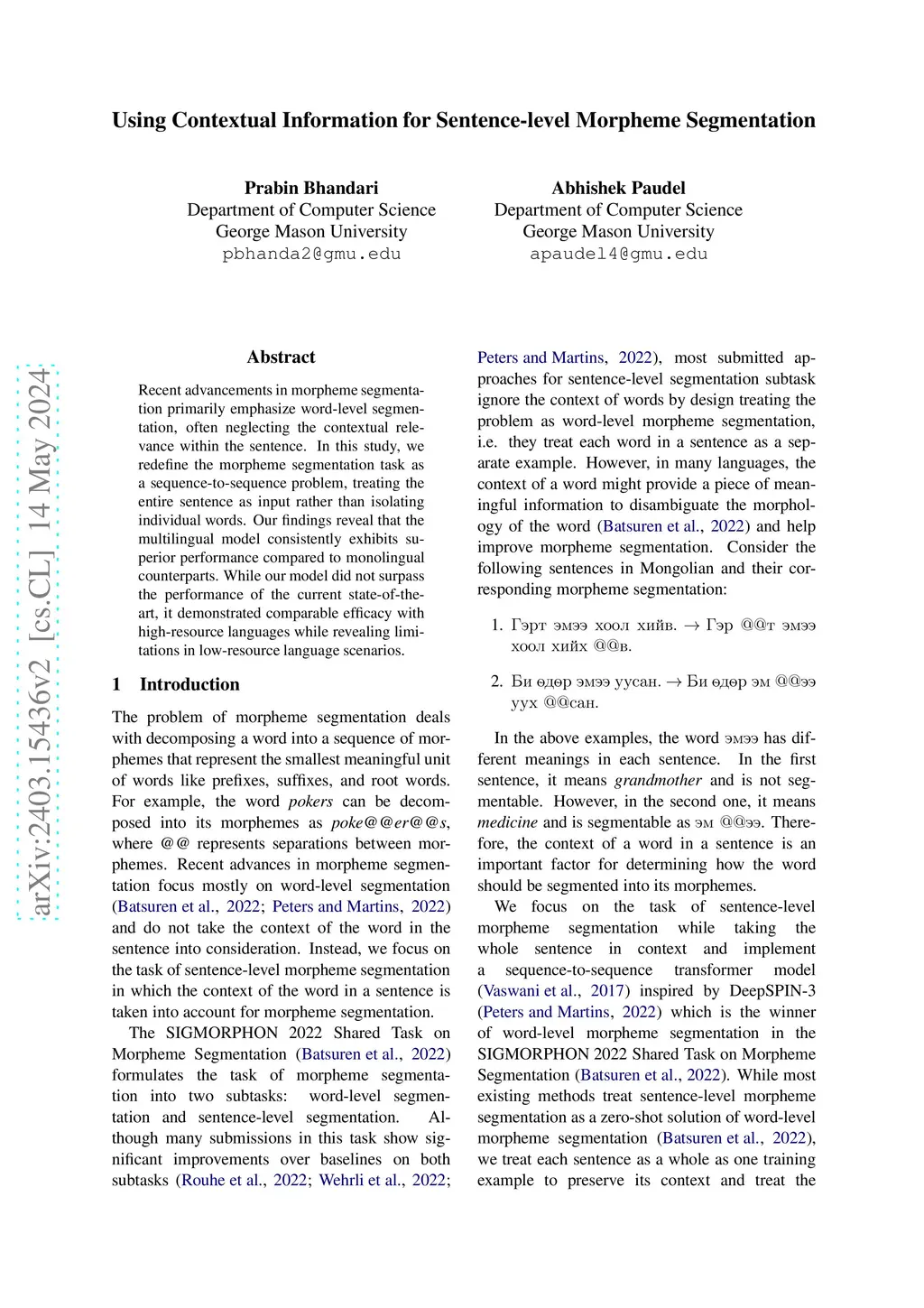 Using Contextual Information for Sentence-level Morpheme Segmentation