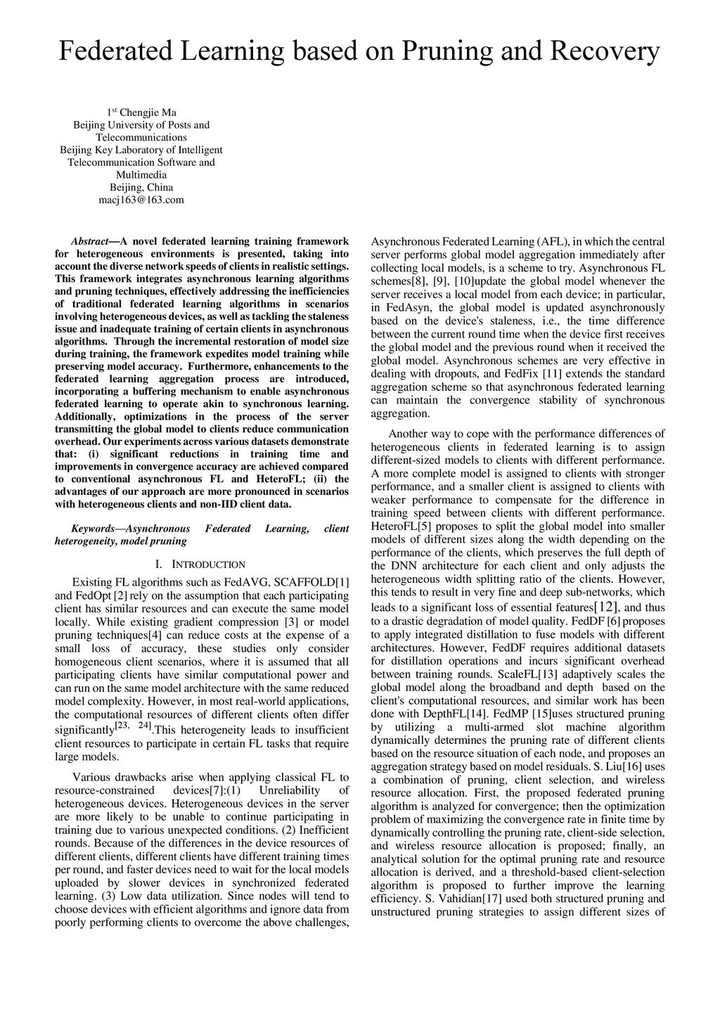 A novel federated learning training framework for heterogeneous environments is presented, taking into account the diverse network speeds of clients in realistic settings. This framework integrates asynchronous learning algorithms and pruning techniques, effectively addressing the inefficiencies of traditional federated learning algorithms in scenarios involving heterogeneous devices, as well as tackling the staleness issue and inadequate training of certain clients in asynchronous algorithms. Through the incremental restoration of model size during training, the framework expedites model training while preserving model accuracy. Furthermore, enhancements to the federated learning aggregation process are introduced, incorporating a buffering mechanism to enable asynchronous federated learning to operate akin to synchronous learning. Additionally, optimizations in the process of the server transmitting the global model to clients reduce communication overhead. Our experiments across various datasets demonstrate that: (i) significant reductions in training time and improvements in convergence accuracy are achieved compared to conventional asynchronous FL and HeteroFL; (ii) the advantages of our approach are more pronounced in scenarios with heterogeneous clients and non-IID client data.