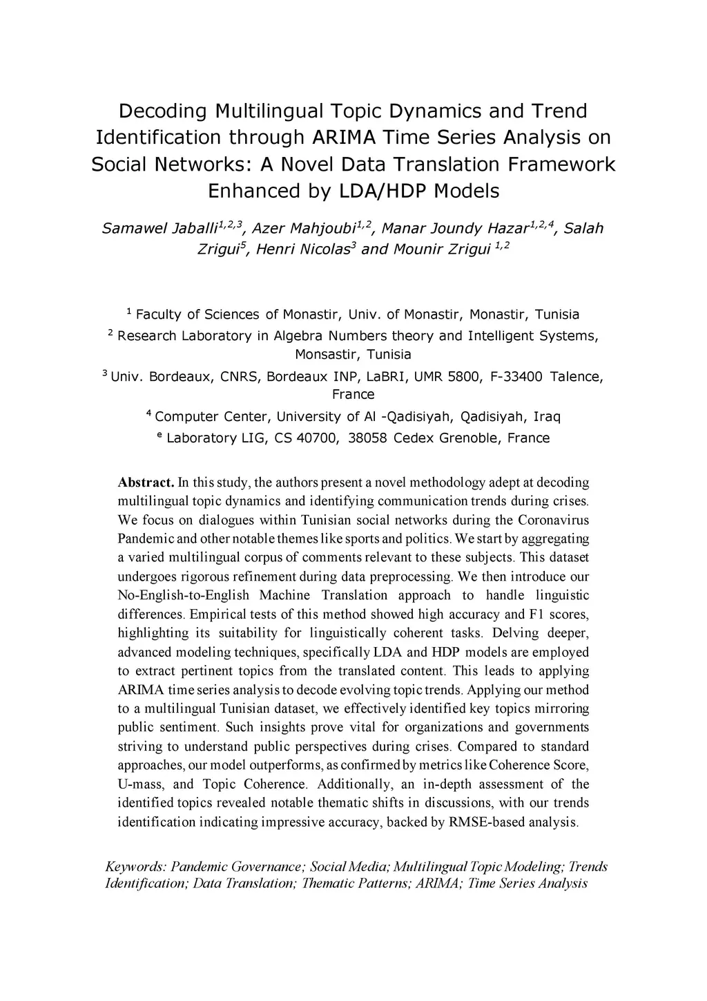 In this study, the authors present a novel methodology adept at decoding multilingual topic dynamics and identifying communication trends during crises. We focus on dialogues within Tunisian social networks during the Coronavirus Pandemic and other notable themes like sports and politics. We start by aggregating a varied multilingual corpus of comments relevant to these subjects. This dataset undergoes rigorous refinement during data preprocessing. We then introduce our No-English-to-English Machine Translation approach to handle linguistic differences. Empirical tests of this method showed high accuracy and F1 scores, highlighting its suitability for linguistically coherent tasks. Delving deeper, advanced modeling techniques, specifically LDA and HDP models are employed to extract pertinent topics from the translated content. This leads to applying ARIMA time series analysis to decode evolving topic trends. Applying our method to a multilingual Tunisian dataset, we effectively identified key topics mirroring public sentiment. Such insights prove vital for organizations and governments striving to understand public perspectives during crises. Compared to standard approaches, our model outperforms, as confirmed by metrics like Coherence Score, U-mass, and Topic Coherence. Additionally, an in-depth assessment of the identified topics revealed notable thematic shifts in discussions, with our trends identification indicating impressive accuracy, backed by RMSE-based analysis.
