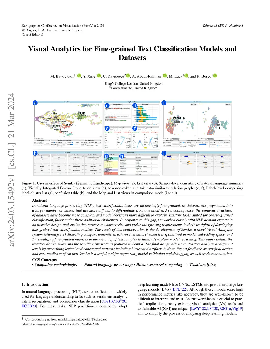 In natural language processing (NLP), text classification tasks are increasingly fine-grained, as datasets are fragmented into a larger number of classes that are more difficult to differentiate from one another. As a consequence, the semantic structures of datasets have become more complex, and model decisions more difficult to explain. Existing tools, suited for coarse-grained classification, falter under these additional challenges. In response to this gap, we worked closely with NLP domain experts in an iterative design-and-evaluation process to characterize and tackle the growing requirements in their workflow of developing fine-grained text classification models. The result of this collaboration is the development of SemLa, a novel visual analytics system tailored for 1) dissecting complex semantic structures in a dataset when it is spatialized in model embedding space, and 2) visualizing fine-grained nuances in the meaning of text samples to faithfully explain model reasoning. This paper details the iterative design study and the resulting innovations featured in SemLa. The final design allows contrastive analysis at different levels by unearthing lexical and conceptual patterns including biases and artifacts in data. Expert feedback on our final design and case studies confirm that SemLa is a useful tool for supporting model validation and debugging as well as data annotation.