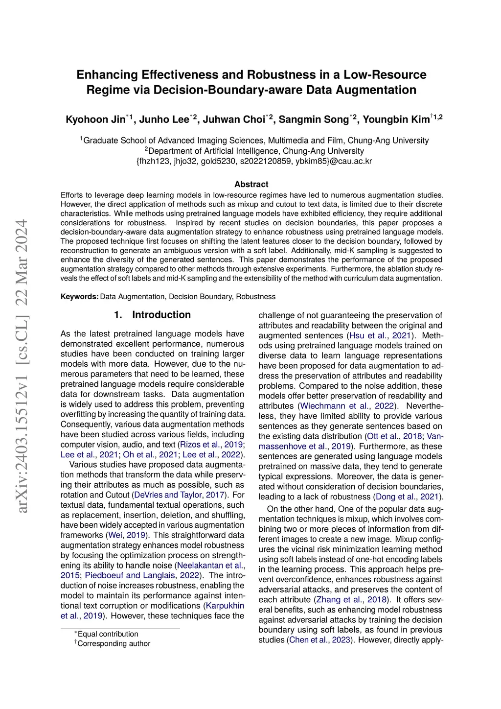 Efforts to leverage deep learning models in low-resource regimes have led to numerous augmentation studies. However, the direct application of methods such as mixup and cutout to text data, is limited due to their discrete characteristics. While methods using pretrained language models have exhibited efficiency, they require additional considerations for robustness. Inspired by recent studies on decision boundaries, this paper proposes a decision-boundary-aware data augmentation strategy to enhance robustness using pretrained language models. The proposed technique first focuses on shifting the latent features closer to the decision boundary, followed by reconstruction to generate an ambiguous version with a soft label. Additionally, mid-K sampling is suggested to enhance the diversity of the generated sentences. This paper demonstrates the performance of the proposed augmentation strategy compared to other methods through extensive experiments. Furthermore, the ablation study reveals the effect of soft labels and mid-K sampling and the extensibility of the method with curriculum data augmentation.